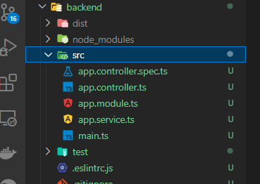 src에는 app.controller.spec.ts, app.controller.ts, app.module.ts, app.service.ts, main.ts 파일이 있습니다.