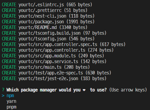 cli를 설치했으면 이제 터미널 상에서 nest를 입력하여 nest 관련 기능을 사용할 수 있습니다. 먼저 새로 프로젝트를 만듭니다.