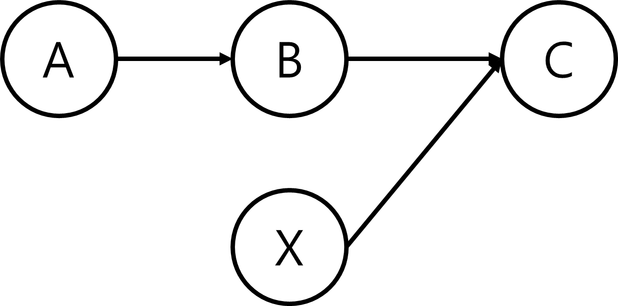 위상 정렬을 수행하기 위해서는 스택과 큐를 사용하는데 보통 큐를 많이 사용한다. 그리고 정점에서 다른 정점으로 이동하는 방향의 개수를 테이블에 초기화한다. 이 방향이 모두 처리 되어야만 해당 정점으로 이동할 조건이 충족되기 때문에 사용한다. 앞선 예제에서는 C의 indegree(C로 들어오는 방향)가 2, B는 1, A와 X는 0이다. 이 의미는 A와 X는 이전에 수행되어야 하는 순서가 없기 때문에 순서에 국한되지 않고 자유롭게 정렬될 수 있다는 의미이다. 반면, B는 A를 방문한 후에 방문해야 하며, C는 B와 X를 방문한 후에 방문해야 한다.