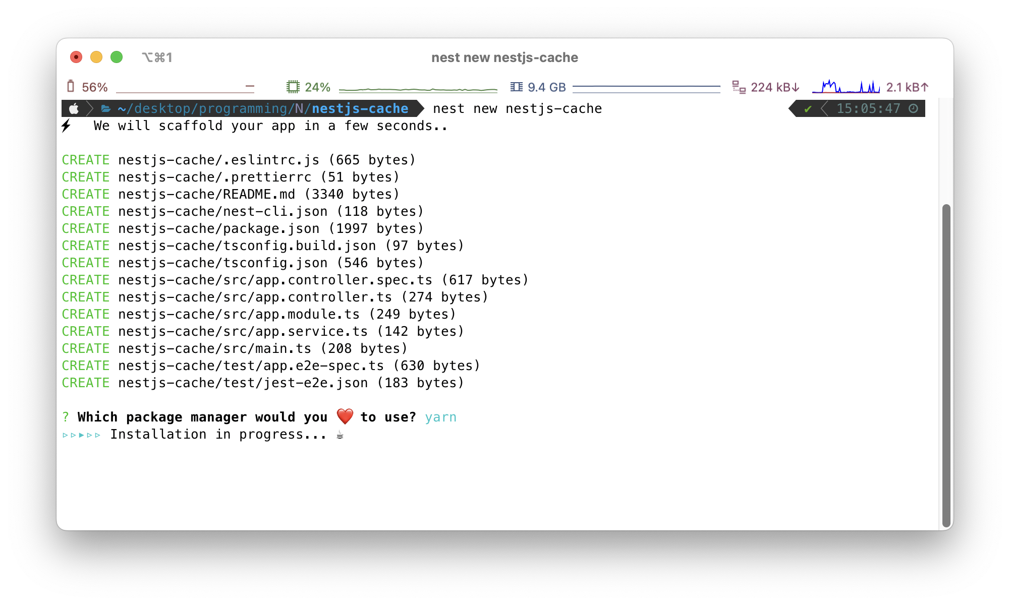 먼저 실습할 프로젝트 폴더를 하나 생성합니다. 저는 nestjs-cache로 명명했습니다.