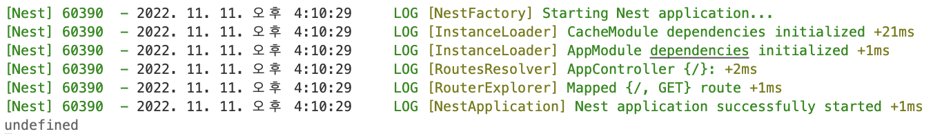 이렇게 캐시 모듈에 새롭게 레디스 스토어를 캐시 저장소로 지정을 했으므로, 이전에 앱 서비스에서 작성한 console.log에서 null을 반환하게 될 것입니다.