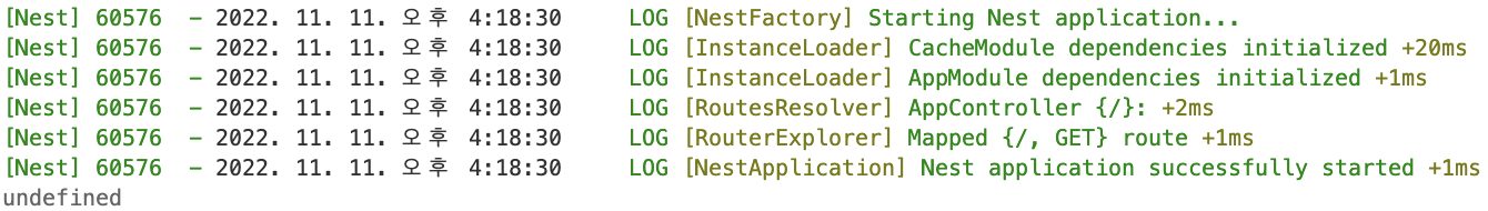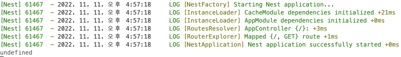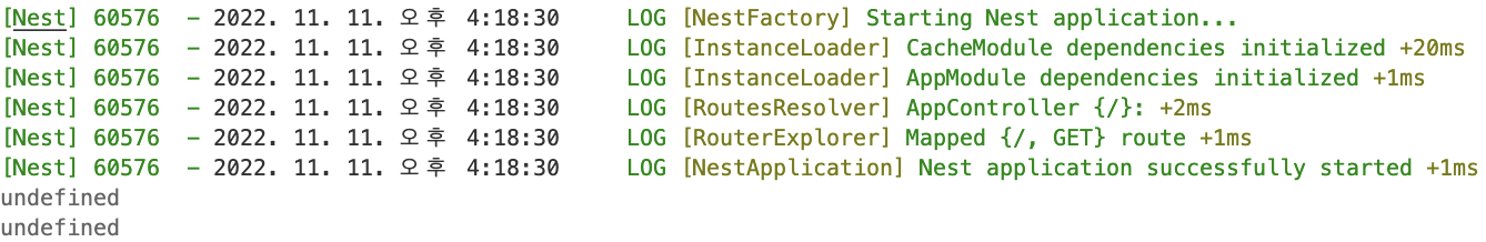이처럼 컨트롤러 스코프에서 인터셉터를 적용하면, 모든 라우트에 대하여 캐싱하며 기본적으로, 앱 모듈에 등록한 캐시 옵션을 기반으로 캐싱을 진행합니다. 신기하게도 기존에 캐싱된 값을 반환하는 라우트가 있어서 이 경로로 빠르게 요청을 여러 번 보내면, 로그에서 undefined라는 로그가 하나 찍히는 것을 볼 수 있는데, 이는 라우트 핸들러를 한 번만 작동시키기 때문입니다. 라우트 핸들러를 한 번 작동하면 응답을 캐시에 등록하기 때문에 다시 핸들러롤 호출할 필요가 없기 때문입니다.