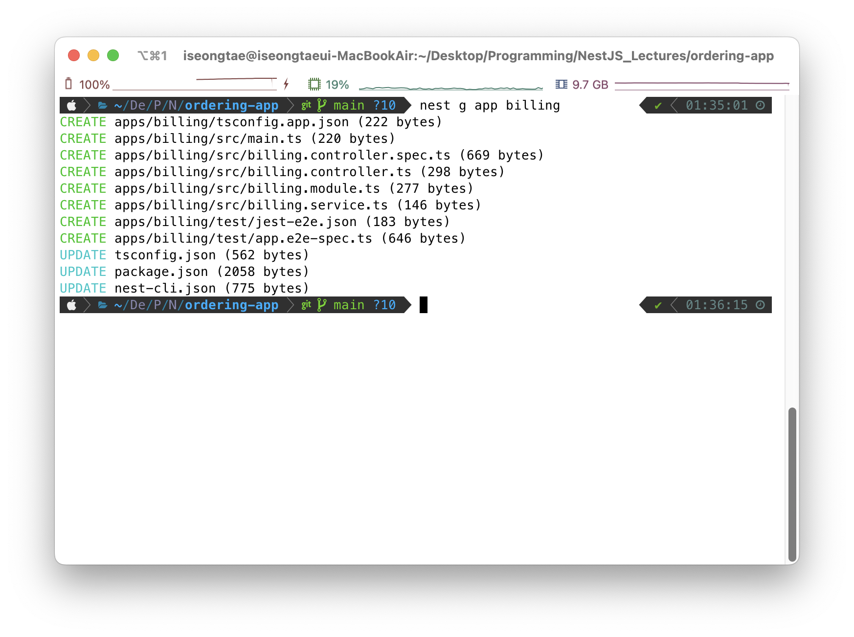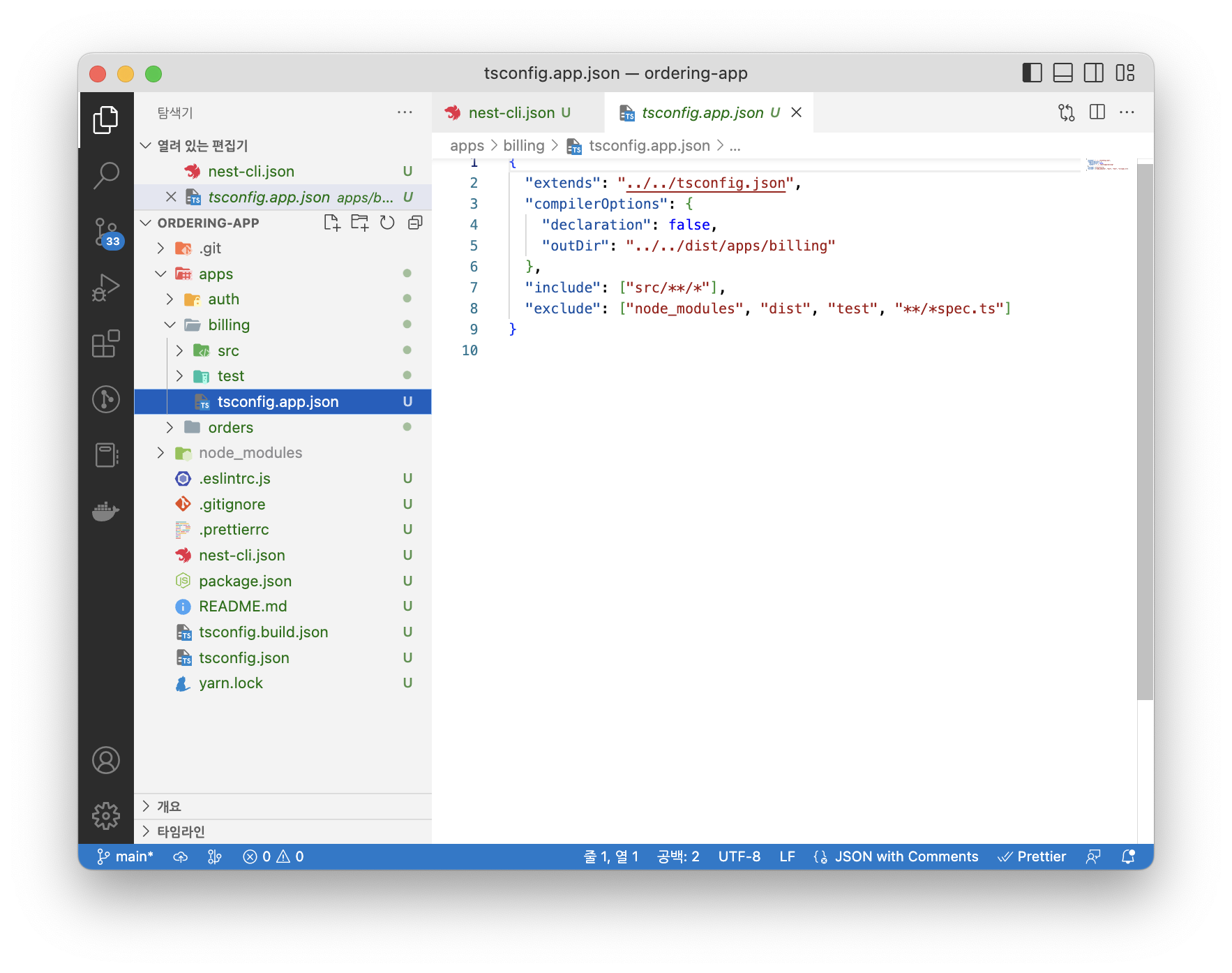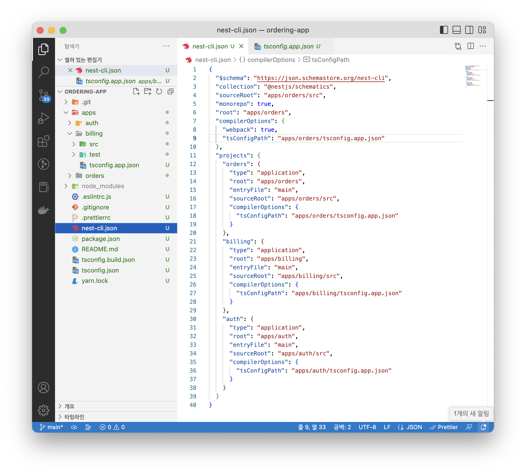 맨 처음에 ordering-app으로 프로젝트를 생성했기에 NestJS의 기본 애플리케이션은 ordering-app입니다. 이 애플리케이션을 모노레포로 만들기 위해서는 다시 nest cli 명령어를 사용해주어야 합니다.