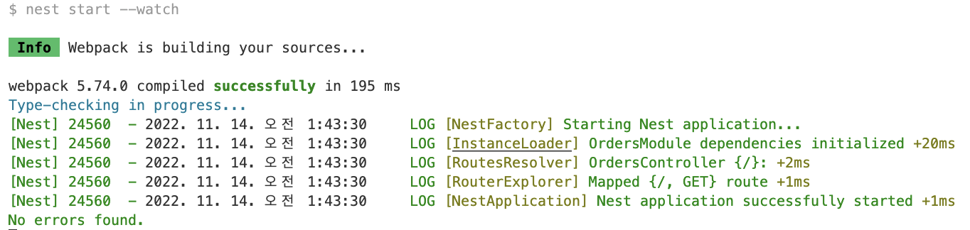 본 화면에서 nest cli 를 통해서 다른 마이크로서비스 애플리케이션을 생성해주도록 합시다. 우리의 주 애플리케이션이 될 orders 애플리케이션을 생성합니다. orders 애플리케이션은 요청을 처리하고 다른 서비스에게 적절한 이벤트를 전달하는 역할을 맡을 것입니다.