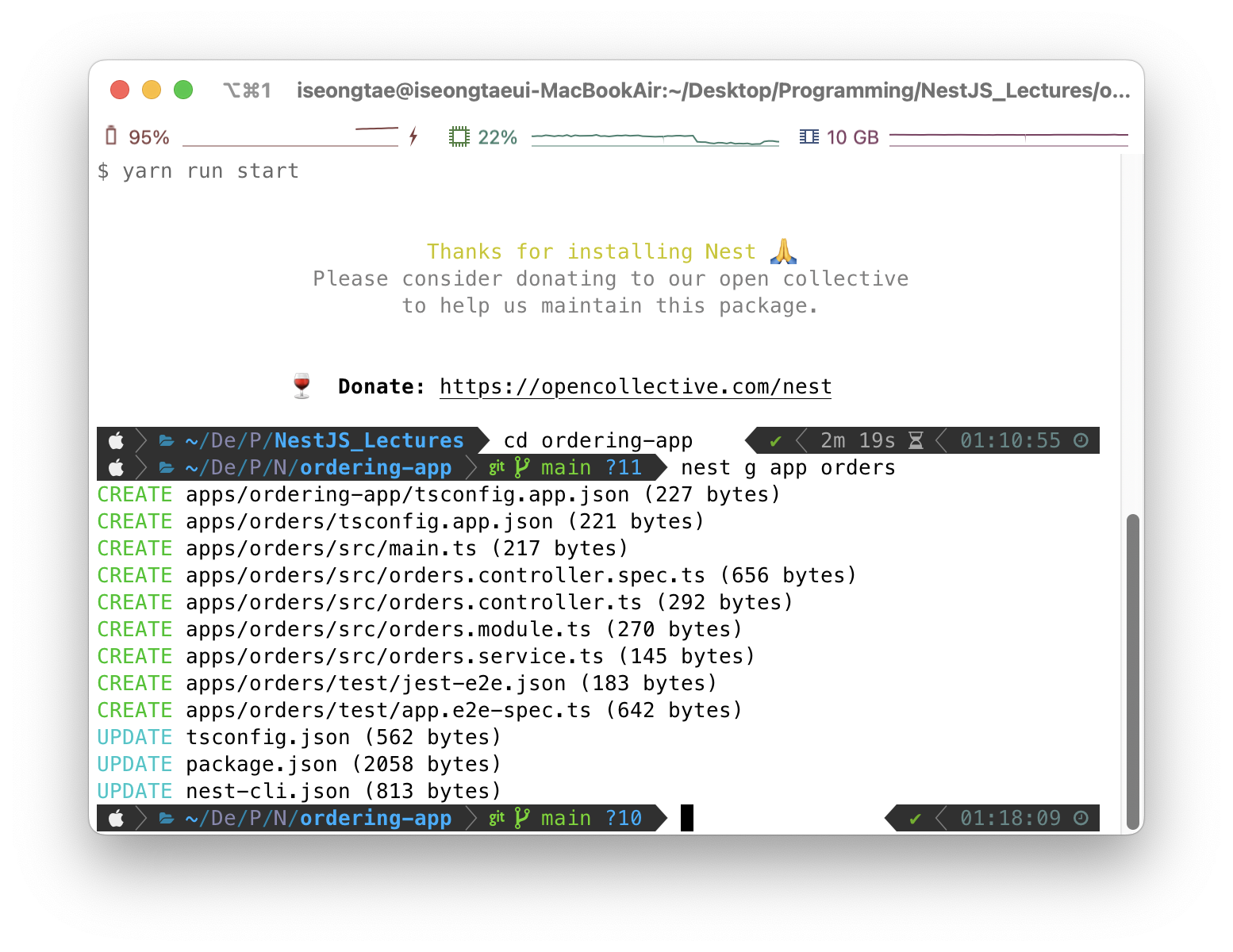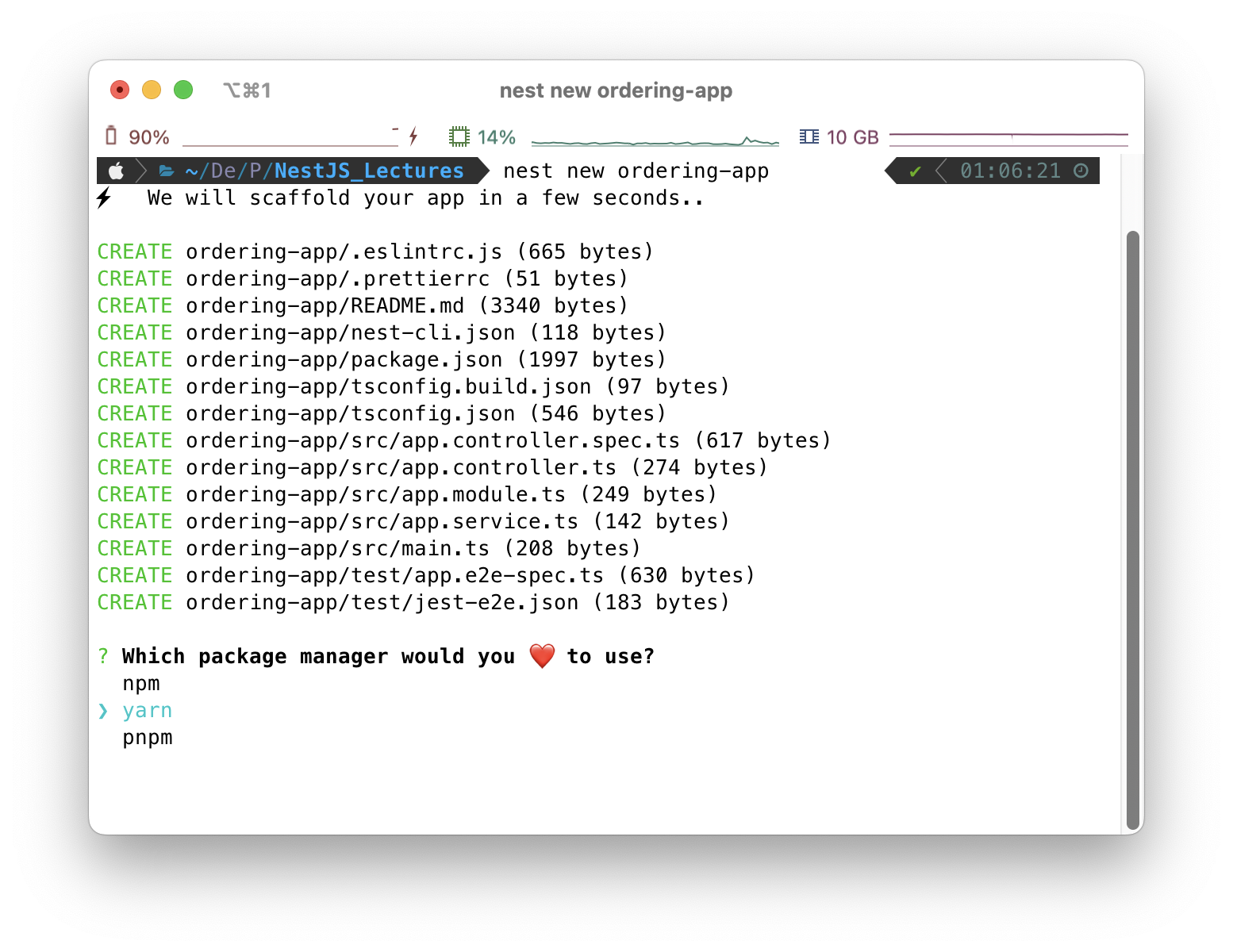 먼저 터미널을 열어서 nest cli를 통해 새롭게 프로젝트를 생성해줍시다. 프로젝트 이름은 ordering-app으로 정했습니다. 패키지 매니저는 yarn을 주로 써와서 yarn으로 정했습니다.