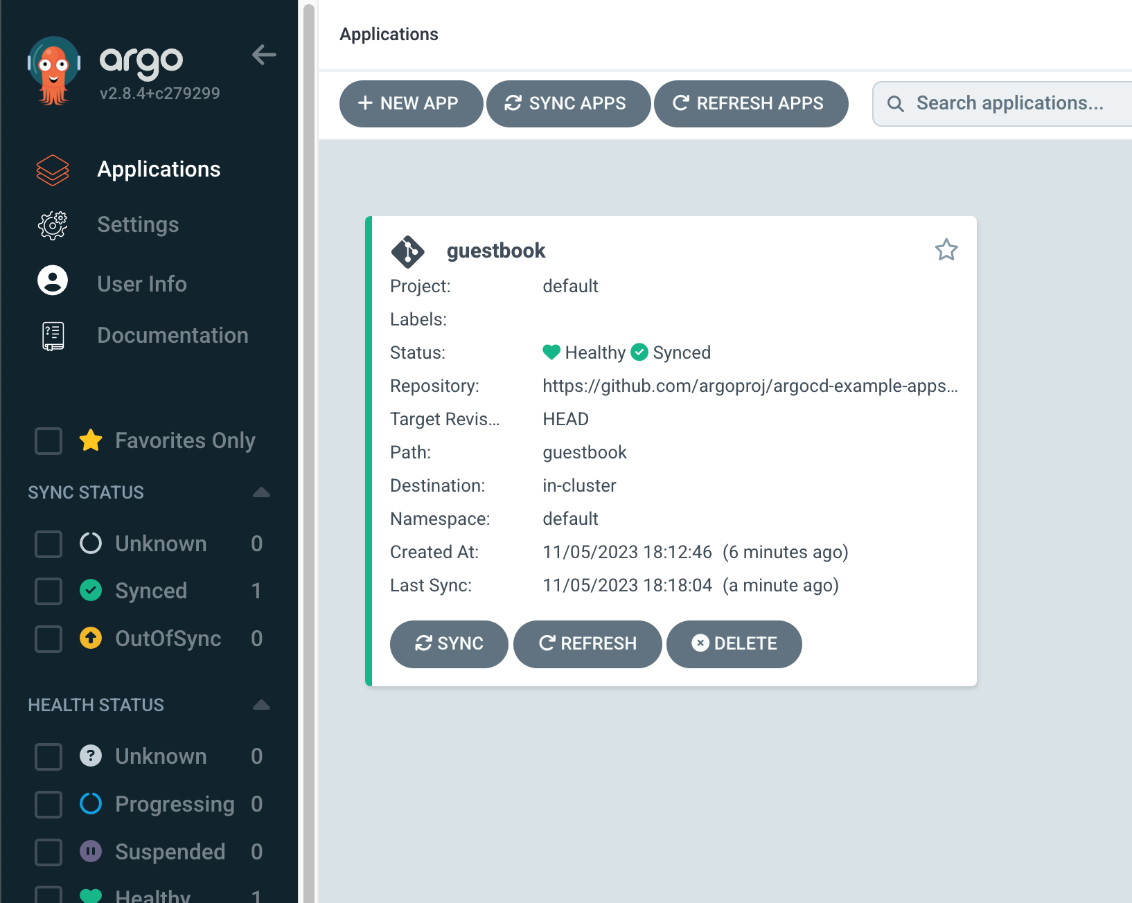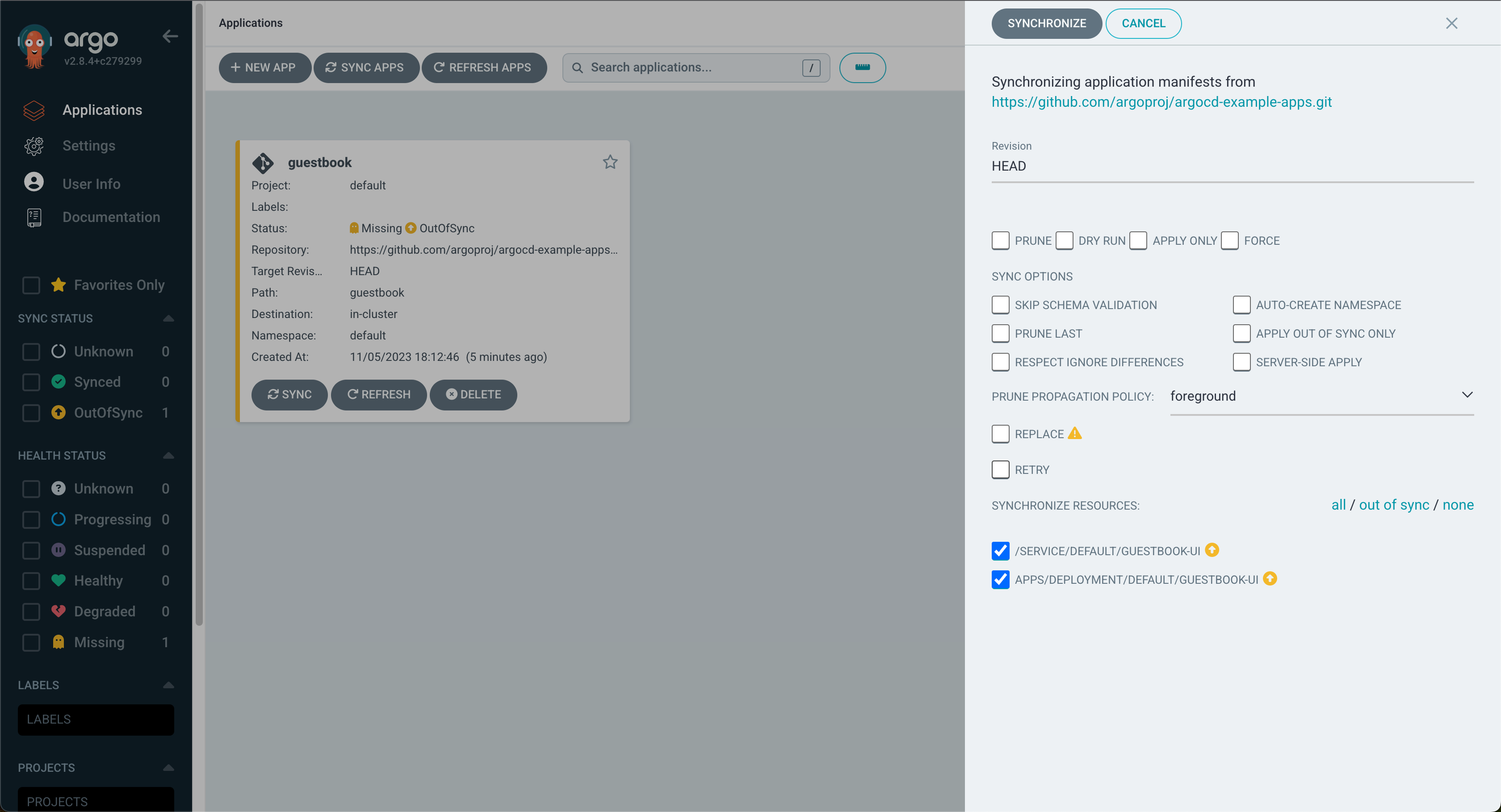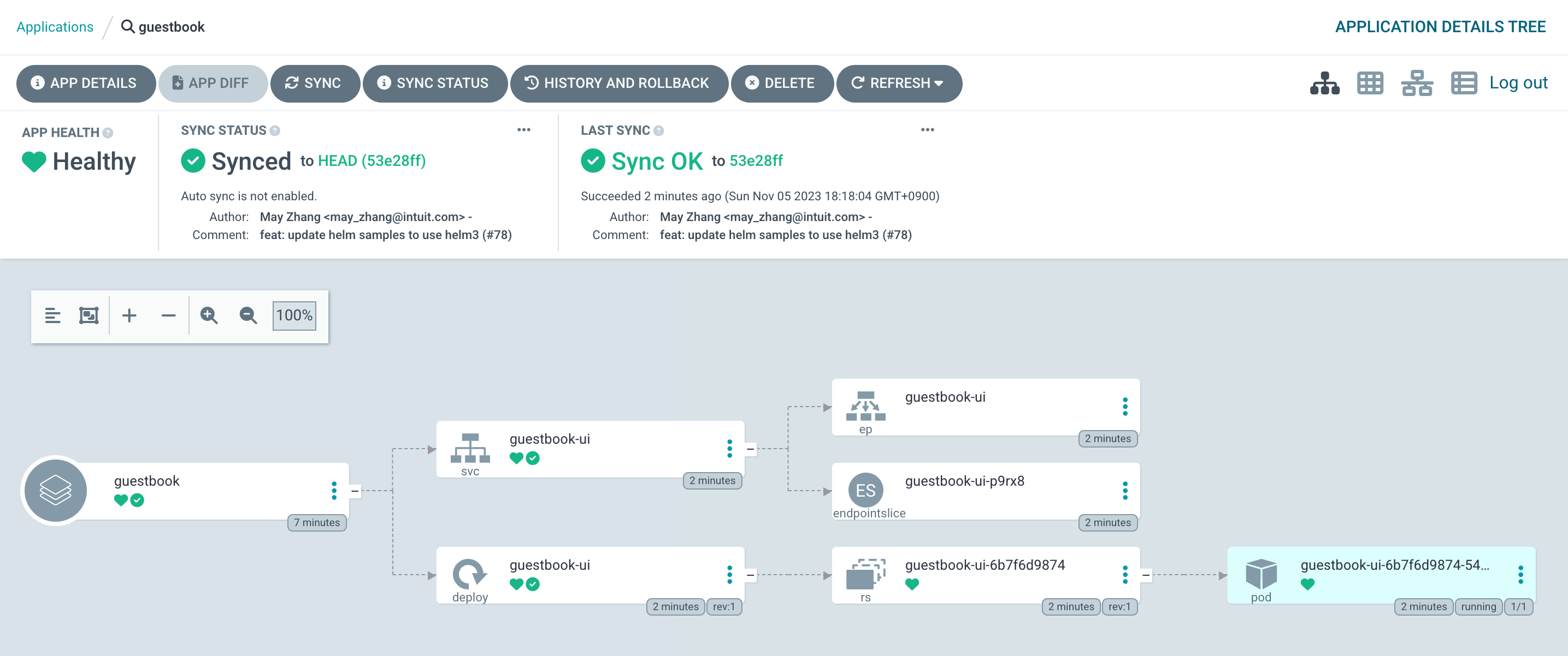 apps Deployment default guestbook-ui Synced Healthy deployment.apps/guestbook-ui created