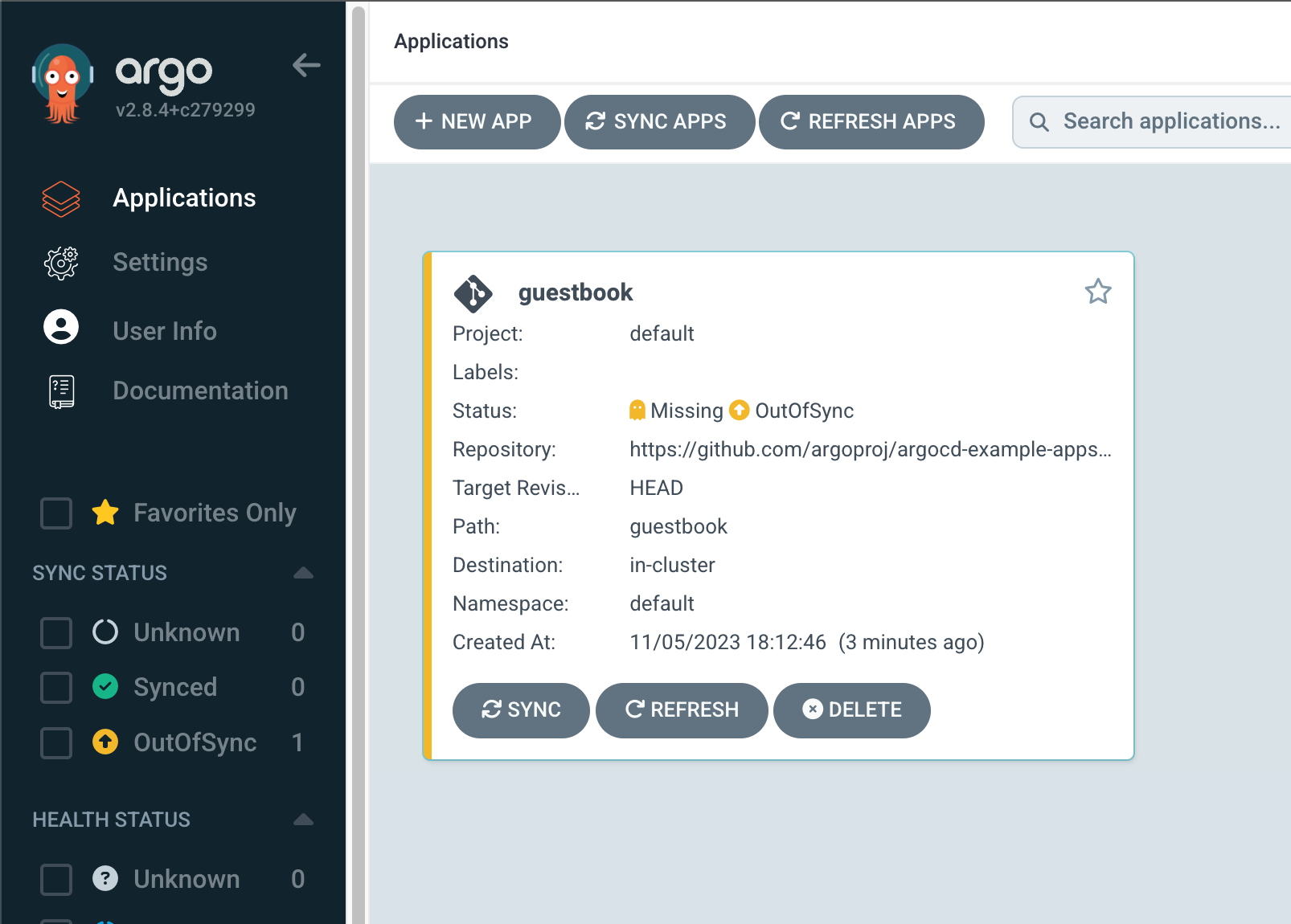 이미 쿠버네티스에 배포하여 Sync Status가 Synced로 나오는데, OutOfSync로 뜨는 게 정상이다. 애플리케이션이 아직 배포되지 않았고, 쿠버네티스 리소스들이 생성되지 않았으므로, 초기에는 Sync Status가 OutOfSync로 뜬다.