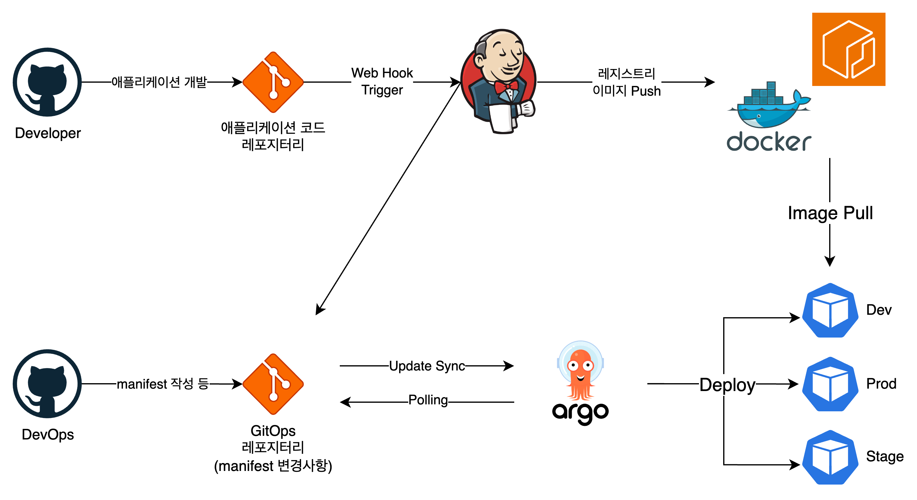 개발자한 애플리케이션 코드를 원격 레포지터리에 반영하고, 이를 ArgoCD가 상태를 비교하고 동기화하여 상태를 맞춘다. 배포된 애플리케이션도 마찬가지로 동기화함으로써 변경사항을 반영한다.