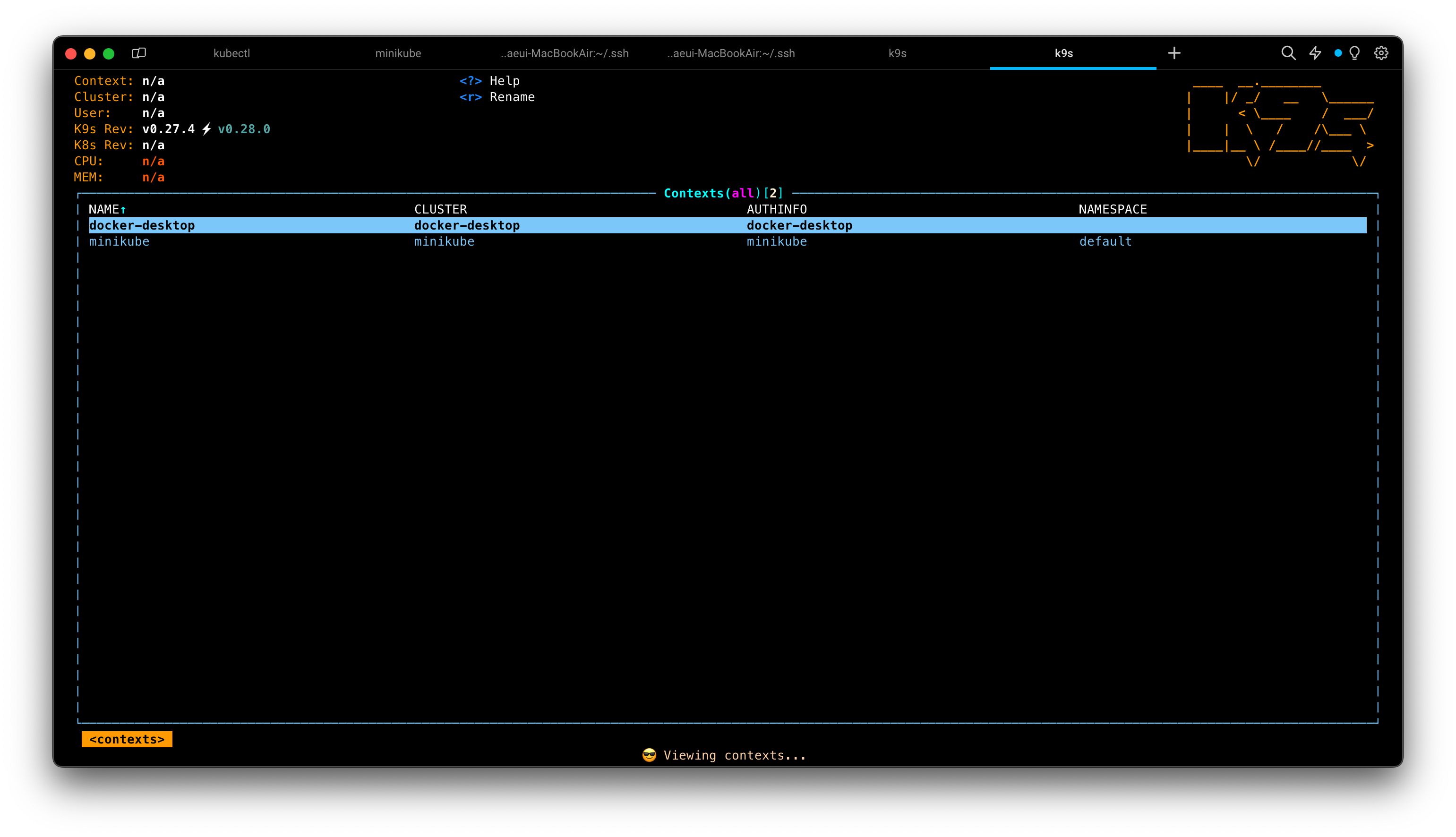 왼쪽 위에 Context와 Cluster가 있는데, 만약 현재 존재하지 않는 context를 넣으면 아래처럼 n/a로 기재되고 전체 Context를 보여준다.