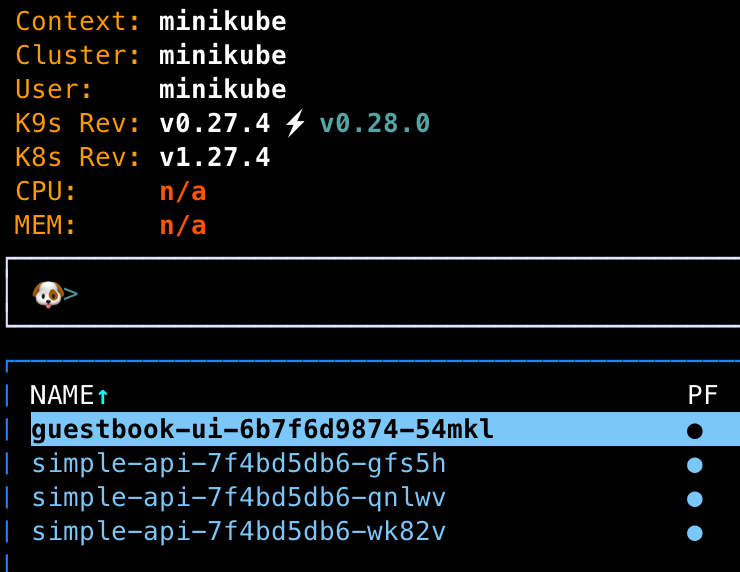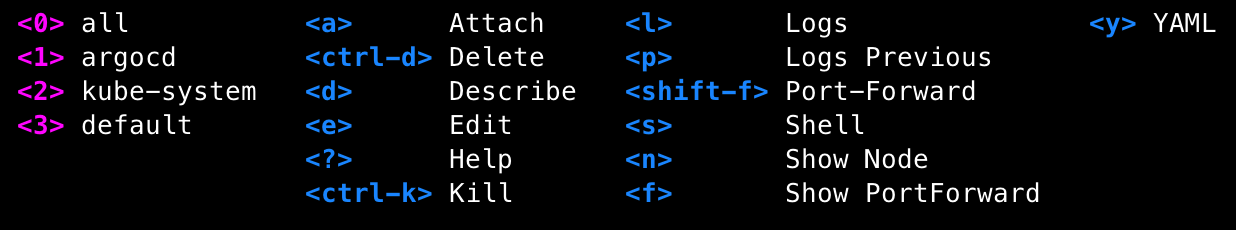 - ?: k9s 터미널에서 바로 ?를 입력하면 컴팩트하게 쓸 수 있는 단축키를 선별해서 보여준다.