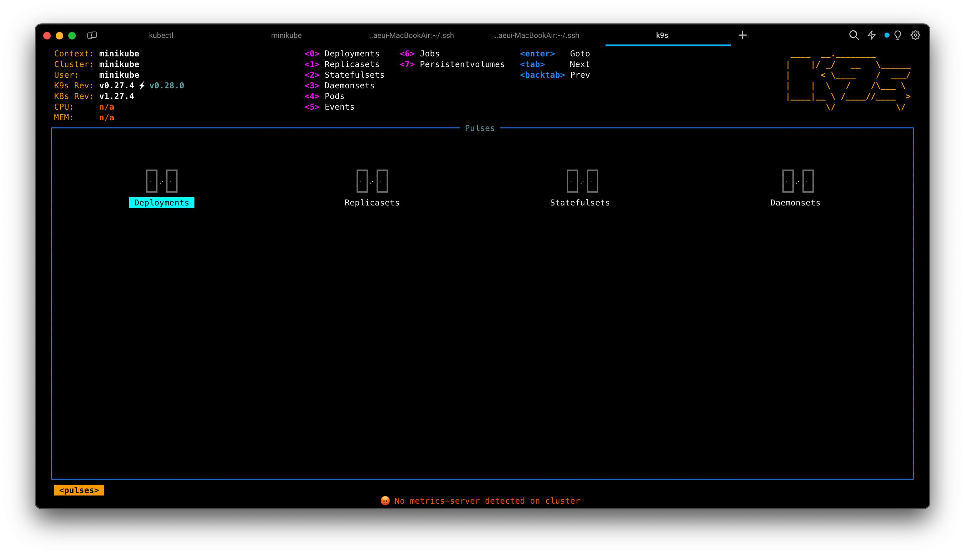 다시 k9s 대시보드를 통해 pulse를 확인할 수 있다. 또한, 좌상단에서 찾지 못한 cpu와 memory의 사용량도 이제 볼 수 있다.