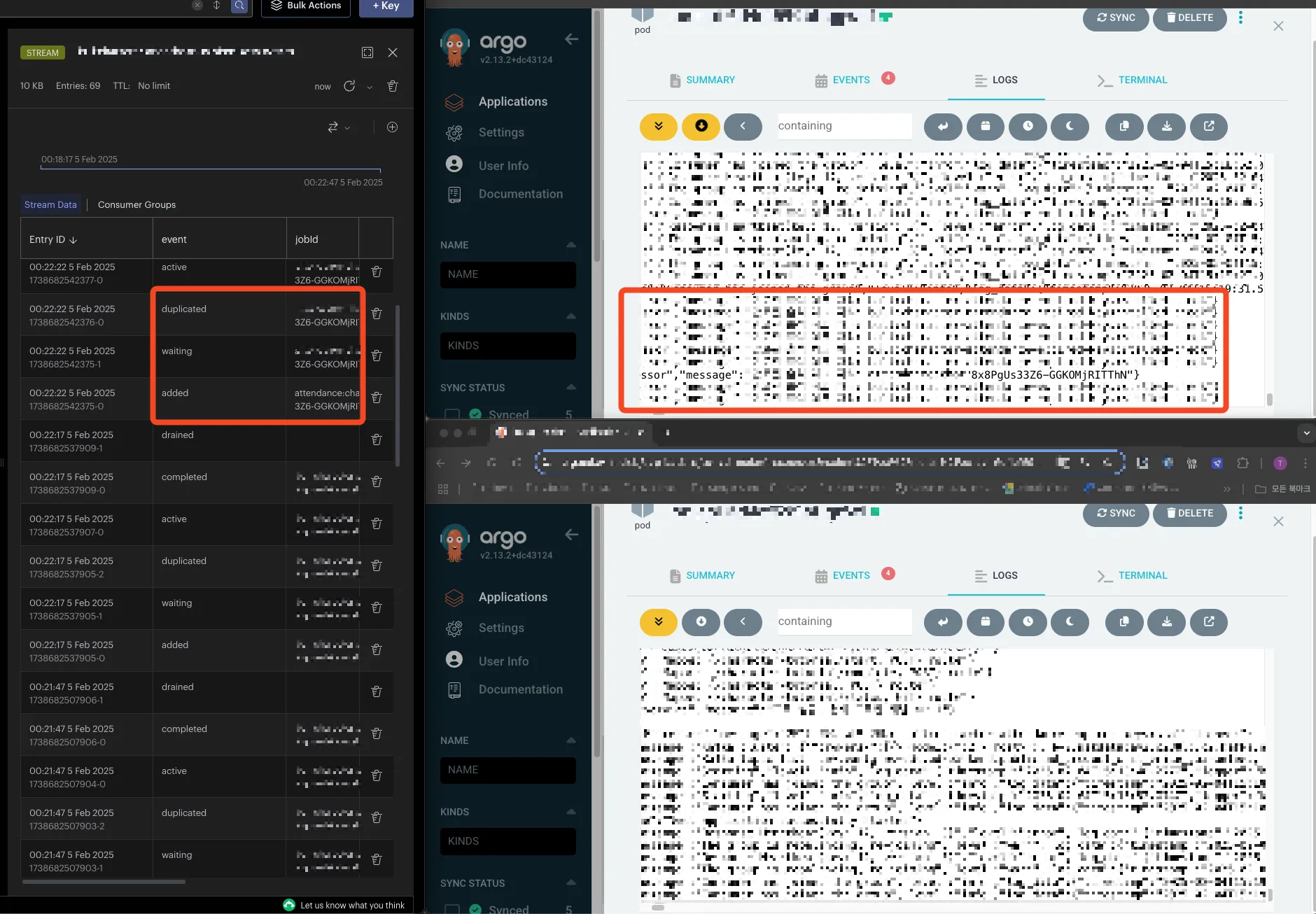 예를 들어 아래 빨간 박스처럼 여러 개의 메시지를 적재할 때, 두 파드에서 같은 키의 이벤트를 발행하였지만 내부적으로 duplicated 처리되어 작업을 수행할 수 있게 됩니다.