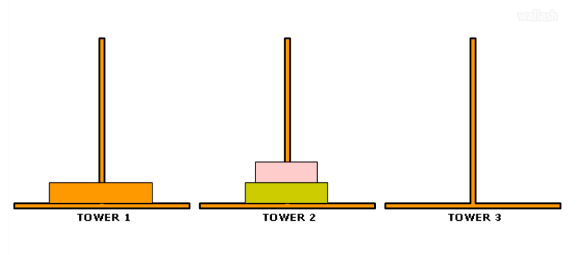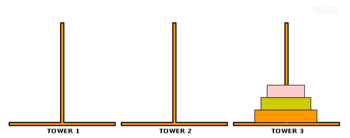 세 개의 장대가 있고 첫 번째 장대에는 반경이 서로 다른 n개의 원판이 쌓여 있다. 각 원판은 반경이 큰 순서대로 쌓여있다. 이제 수도승들이 다음 규칙에 따라 첫 번째 장대에서 세 번째 장대로 옮기려 한다.
