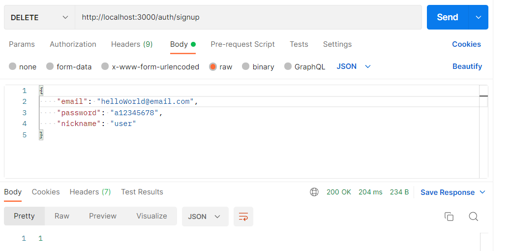 일단 POST /auth/signup 요청을 통해 회원가입하여 데이터베이스에 값을 넣겠습니다.