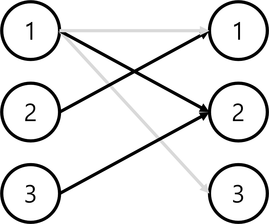 1번 팬은 욕심이 많아서 1, 2, 3번 모두를 원하고 2번 팬은 1번 그리고 3번 팬은 2번을 원한다. 즉, 그림으로 표현하면 아래와 같다.