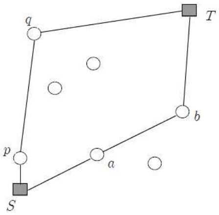 위 그림은 S, T와 7개의 중간 비행장의 위치를 나타내고 있는 그림이다. 위 예제에서 중간급유를 위한 착륙 허용 최대횟수 k=2라면 S-a-b-T로 가는 항로가 S-p-q-T로 가는 항로 보다 연료통이 작게 된다. 왜냐하면, S-p-q-T항로에서 q-T의 길이가 매우 길어서 이 구간을 위해서 상당히 큰 연료통이 필요하기 때문이다. 문제는 이와 같이 중간에 최대 K번 내려서 갈 수 있을 때 최소 연료통의 크기가 얼마인지를 결정하여 출력하면 된다. 참고사항은 다음과 같다.