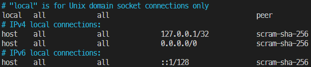 아래로 내리다보면 # IPv4 local connections: 항목이 있는데 여기에 해당 아이피주소를 입력합니다.