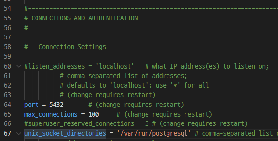 ubuntu에서 /etc/postgres/[postgresql 버전]/main/postgresql.conf 파일을 수정해줍니다.