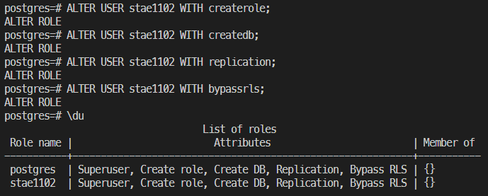 여기서 원하는 유저를 생성할 수 있습니다. psql에서 CREATE를 사용합니다.