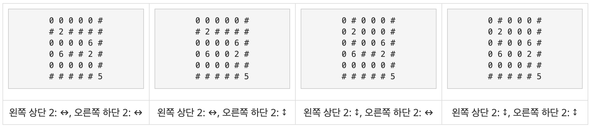 둘째 줄부터 N개의 줄에는 사무실 각 칸의 정보가 주어진다. 0은 빈 칸, 6은 벽, 1~5는 CCTV를 나타내고, 문제에서 설명한 CCTV의 종류이다.