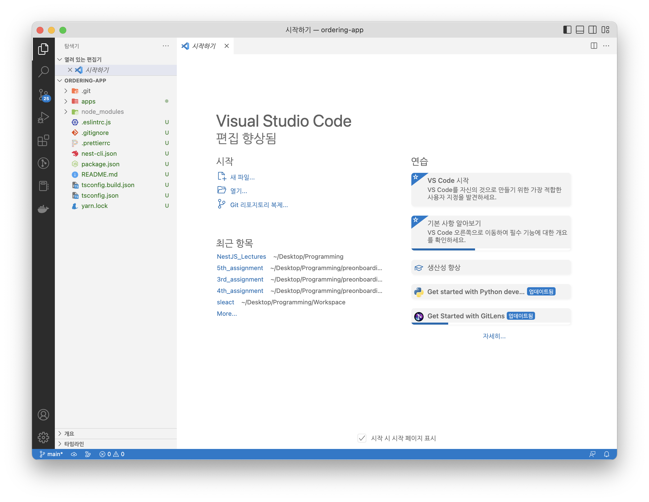 맨 처음에 ordering-app으로 프로젝트를 생성했기에 NestJS의 기본 애플리케이션은 ordering-app입니다. 이 애플리케이션을 모노레포로 만들기 위해서는 다시 nest cli 명령어를 사용해주어야 합니다.