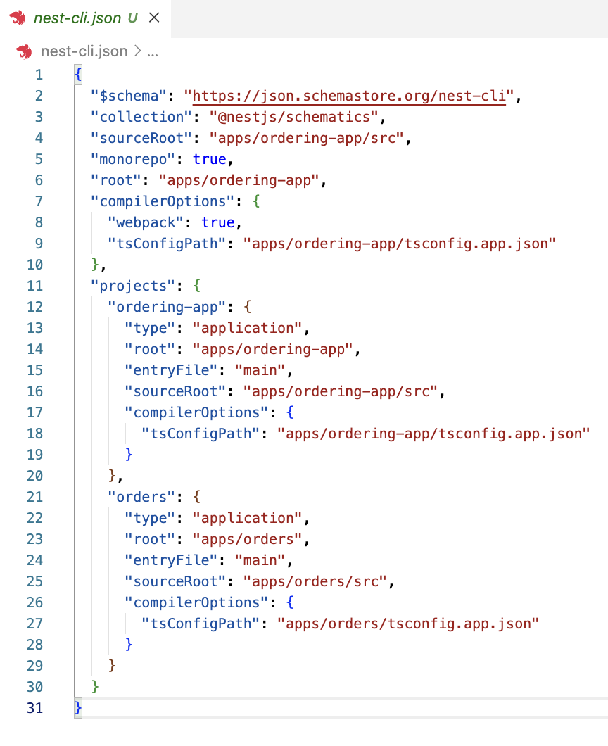 그 다음으로 기본적으로 생성된 apps/ordering-app 디렉터리를 삭제해줍시다. ordering-app을 삭제했으므로 nest-cli.json에서도 해당 내용을 지워야겠죠? 그리고 루트 애플리케이션을 orders로 할 예정이므로 nest-cli.json의 root, sourceRoot, tsConfigPath 또한 orders를 기준으로 변경시켜줍시다.