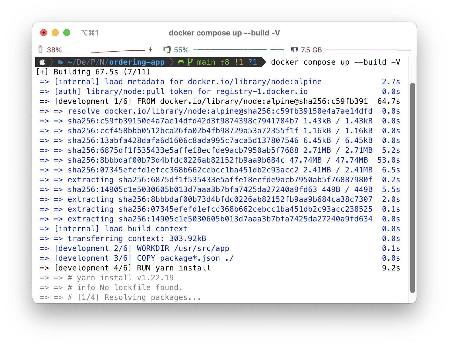 node먼저 루트 디렉터리에 있는 package.json을 이미지의 경로에 복사하고, yarn을 통해 패키지를 설치합니다. 그 후에 모든 프로젝트를 복사하고, js로 컴파일하여 빌드하는 과정으로 진행됩니다. 최종적으로 가장 하단에서 dist/apps/orders/main을 node 명령어로 하여 애플리케이션을 구동합니다.