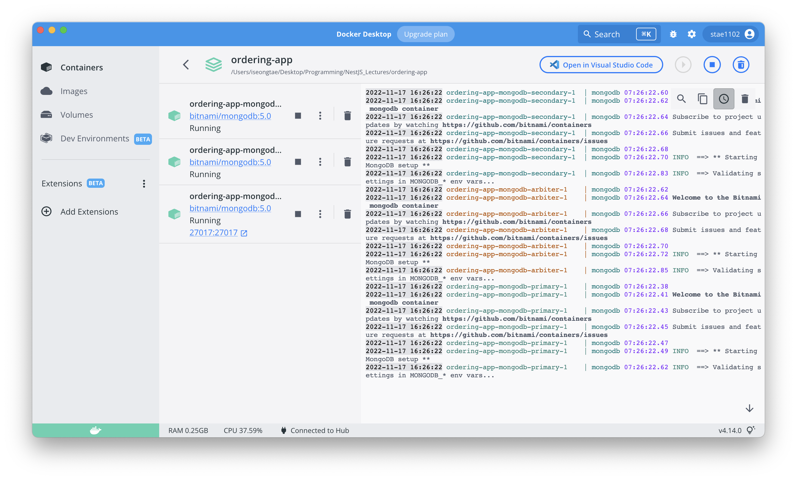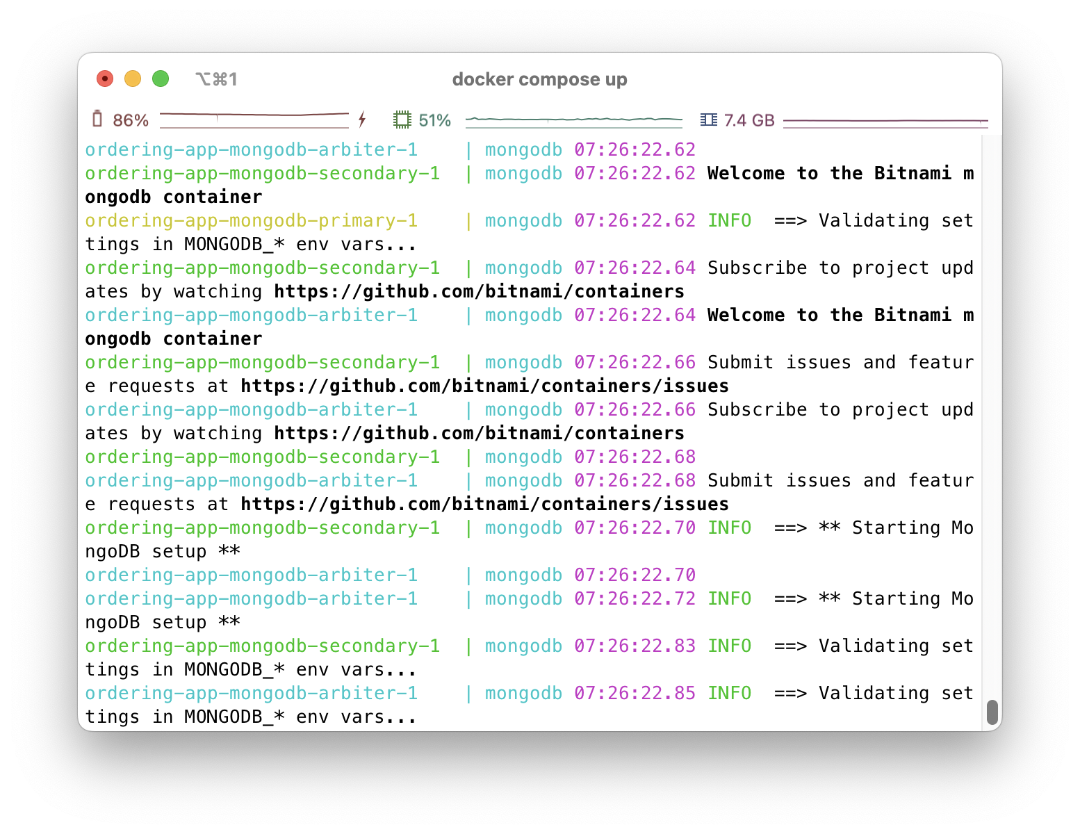 ⚠️ m1에서는 bitnami/mongodb 이미지의 arm 아키텍처가 없기 때문에 계속해서 접속이 불가합니다. 그렇기 때문에 일부 내용을 수정해야 합니다. 기존에 사용하던 이미지는 docker hub의 공식 이미지를 사용하며, 해당 이미지에 필요한 환경변수는 공식적으로 제안하는 변수명을 사용해주도록 합시다. 수정한 내용은 아래에 올려놓았습니다.