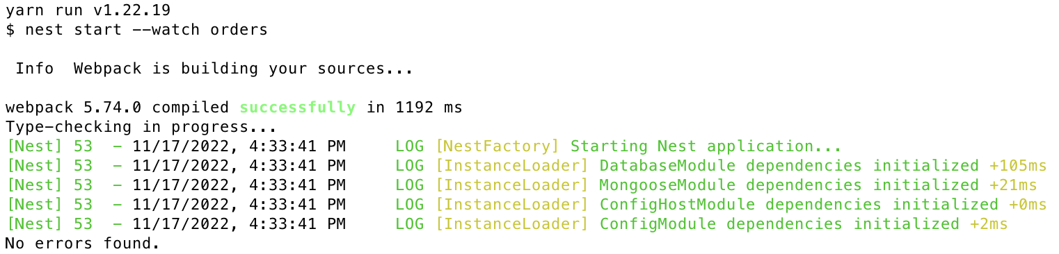 command: yarn start:dev orders