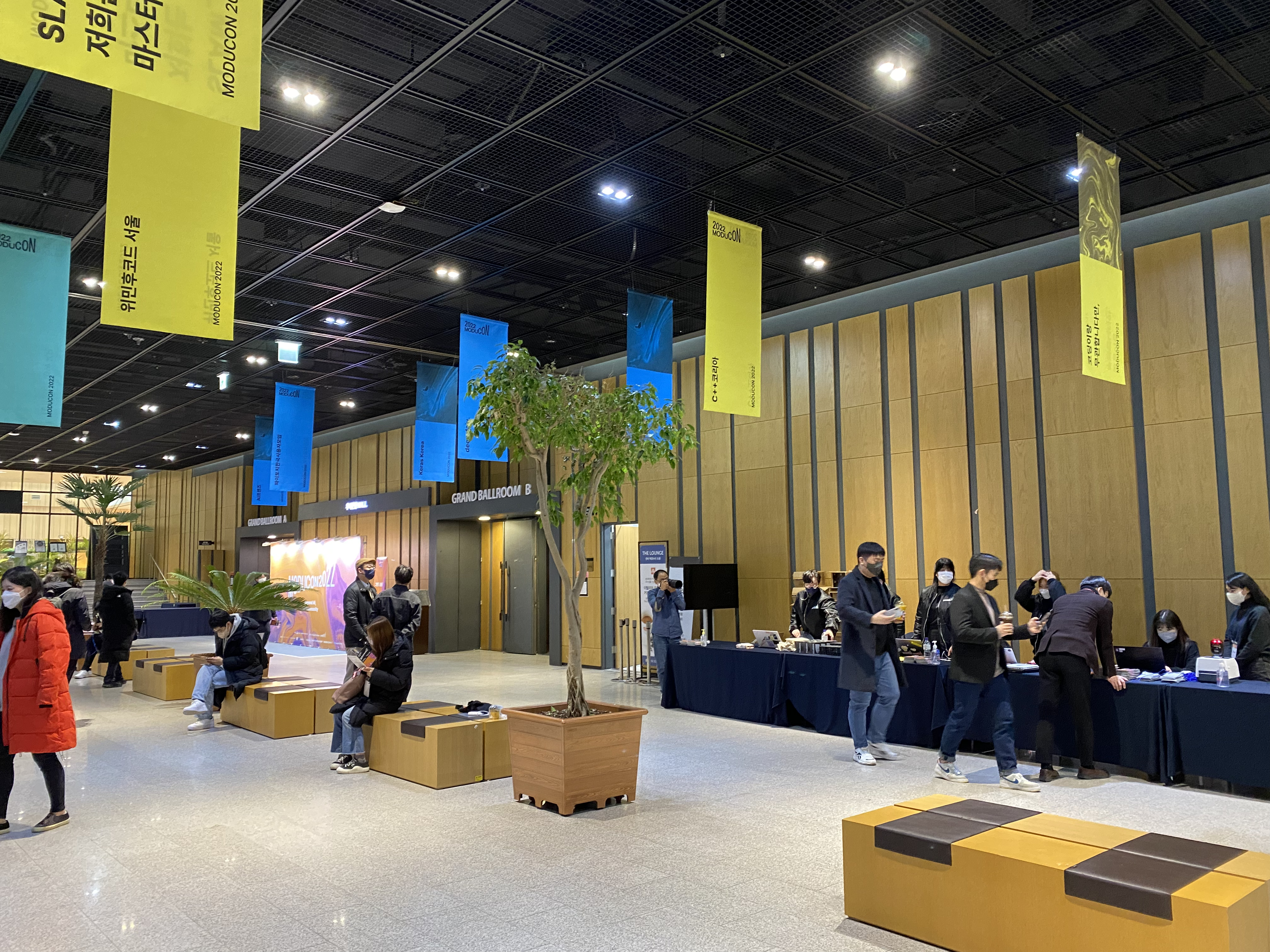 장소는 연세대학교 백양누리홀에서 진행이 되었습니다. 내부 시설이 깔끔해서 좋은 인상을 받았고, 장소도 가까운 거리에 모여 있어서 세션 간 이동에도 편리했습니다. 특히 천장 배너들이 인상 깊어서 좋았습니다. 비록 이번이 첫 컨퍼런스 참여이지만, 이 행사를 위해서 얼마나 많은 세션이 준비되어 있으며, 후원 및 각종 개발 커뮤니티가 적극적으로 참여해주고 있는지 한 눈에 알 수 있었습니다. 그래서 배너 사진을 꽤 열심히 찍었던 것 같습니다.