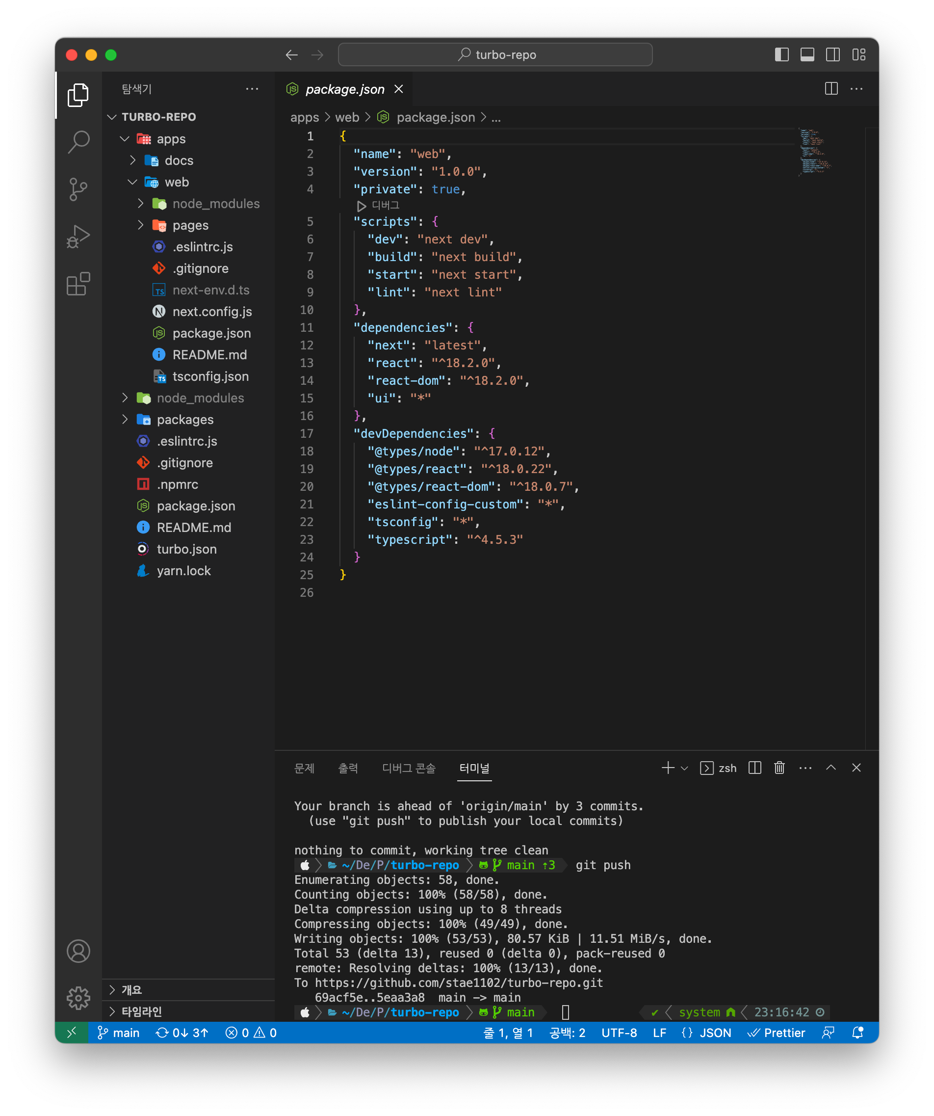 그다음 ./apps/web/package.json에서도 "name": "web"라고 적혀있다.