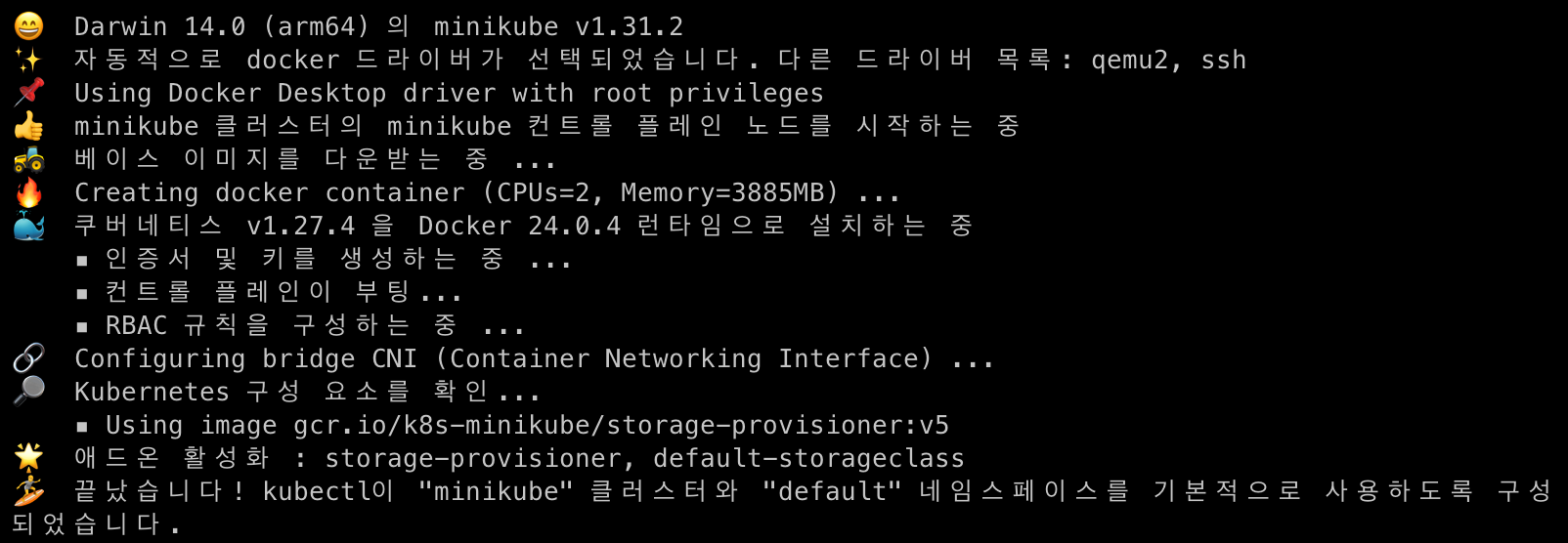 🏄 끝났습니다! kubectl이 "minikube" 클러스터와 "default" 네임스페이스를 기본적으로 사용하도록 구성되었습니다.