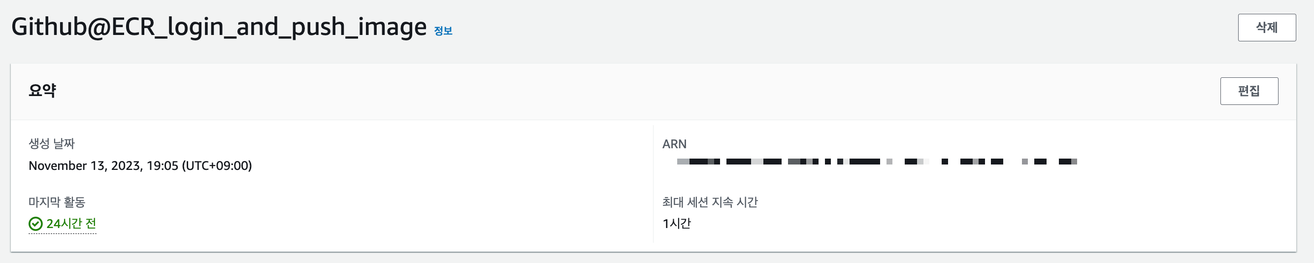 역할 이름과 설명을 작성하고, 신뢰 정책까지 검토한 다음 역할 생성을 클릭합니다. 저는 알아보기 쉽게 Github@ECR_login_and_push_image로 지정했습니다.