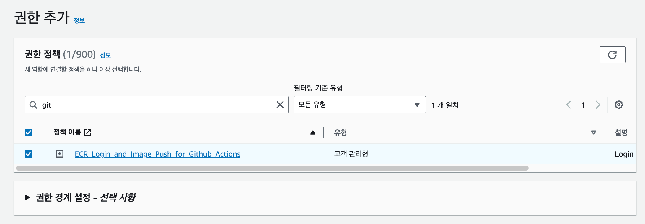 앞서 생성한 정책을 지정해줍니다. 아니면 AmazonEC2ContainerRegistryPowerUser 정책을 선택해도 앞서 필요했던 역할을 포함하고 있으니 이걸 선택해도 됩니다.