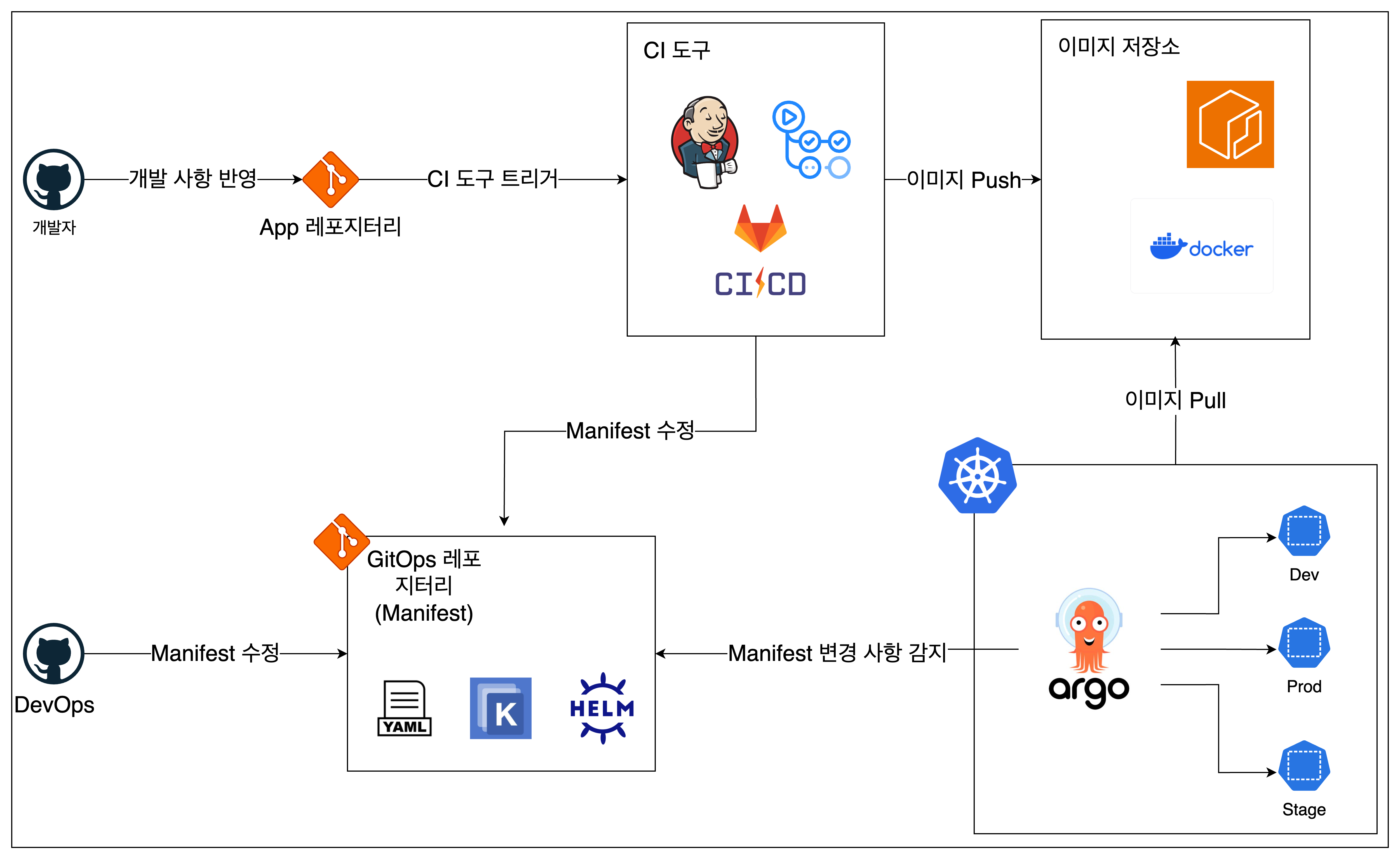 - Manifest 수정: Manifest는 kubernetes 오브젝트 상세를 kubernetes에 적용시킬 때 필요한 파일입니다. 기본적으로 YAML 형태의 파일들이 있으며, 이를 지원해주는 Kustomize나 Helm을 사용하여 오브젝트를 적용시킬 수 있습니다. 애플리케이션 레포지터리에서 변경된 내용을 토대로 manifest 속 내용을 수정합니다. 예를 들어, 이미지 태그를 수정할 수 있습니다.