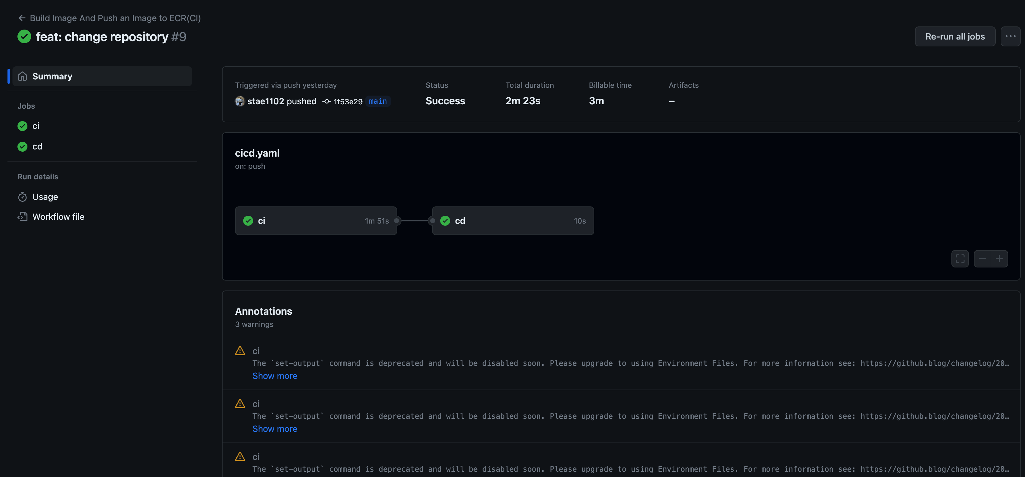 이렇게 CI 과정이 대부분 마무리 되었습니다. 여기서 manifest를 수정하는 과정만 추가하면 추가되면 마무리 될 것 같네요.