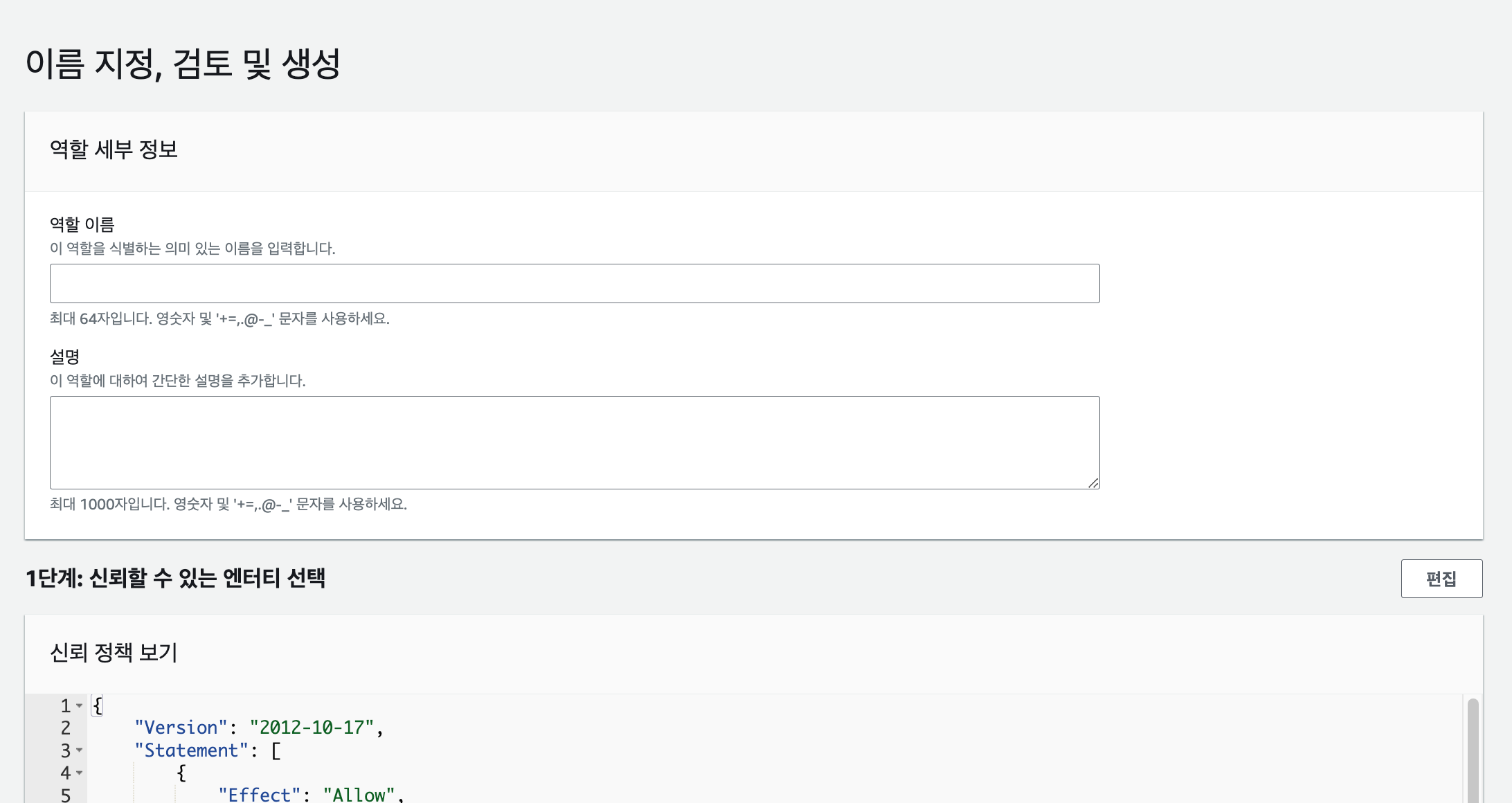 다음으로는 역할을 생성합니다. IAM > 역할 > 역할 생성으로 이동합니다. 그 후 아래와 같이 필요한 정보를 작성합니다.