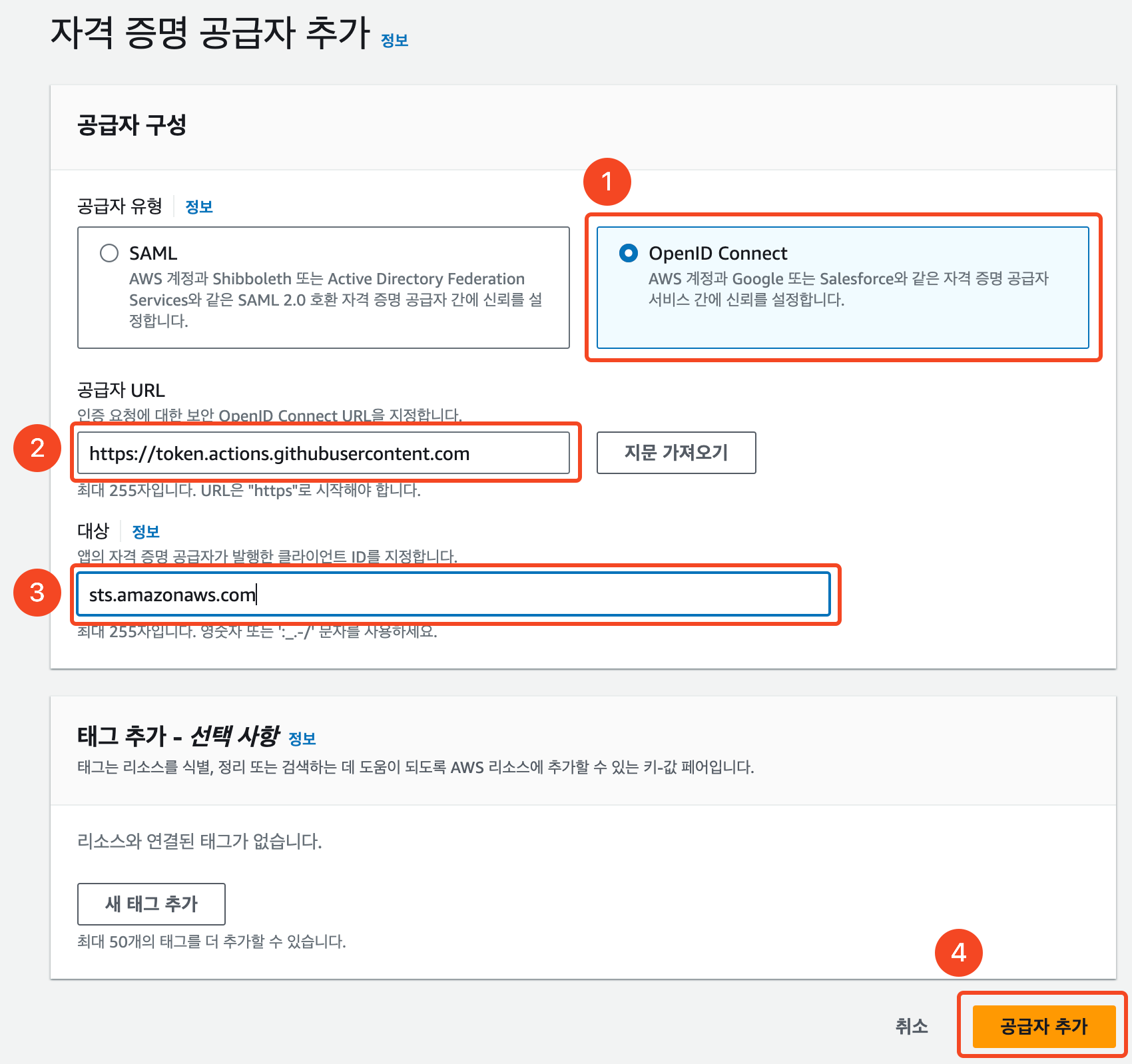 공급자 url에는 https://token.actions.githubusercontent.com 를 입력하고 대상에는 sts.amazonaws.com 를 입력합니다.