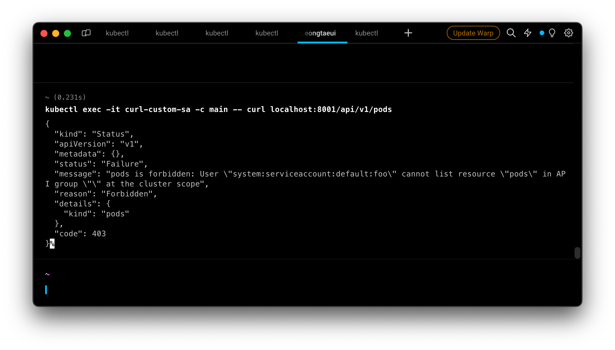 API 서버와 통신하기 위해 서비스 어카운트의 토큰을 사용할 수 있습니다. 하지만 지금은 별도의 권한을 설정하지 않은 서비스 어카운트이므로 획득할 수 없습니다.