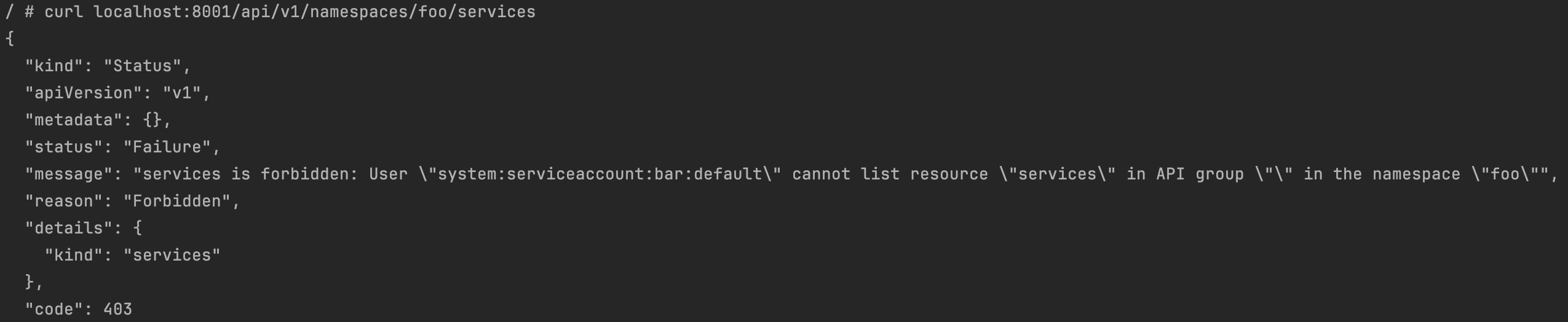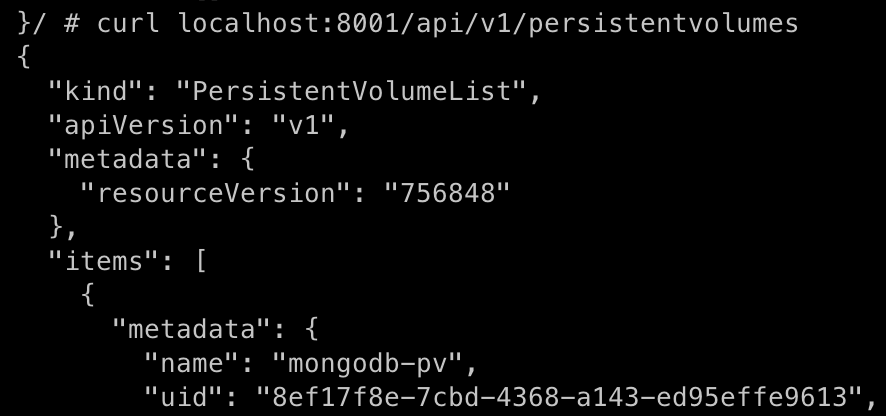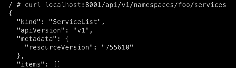 / # curl localhost:8001/api/v1/namespaces/foo/services
