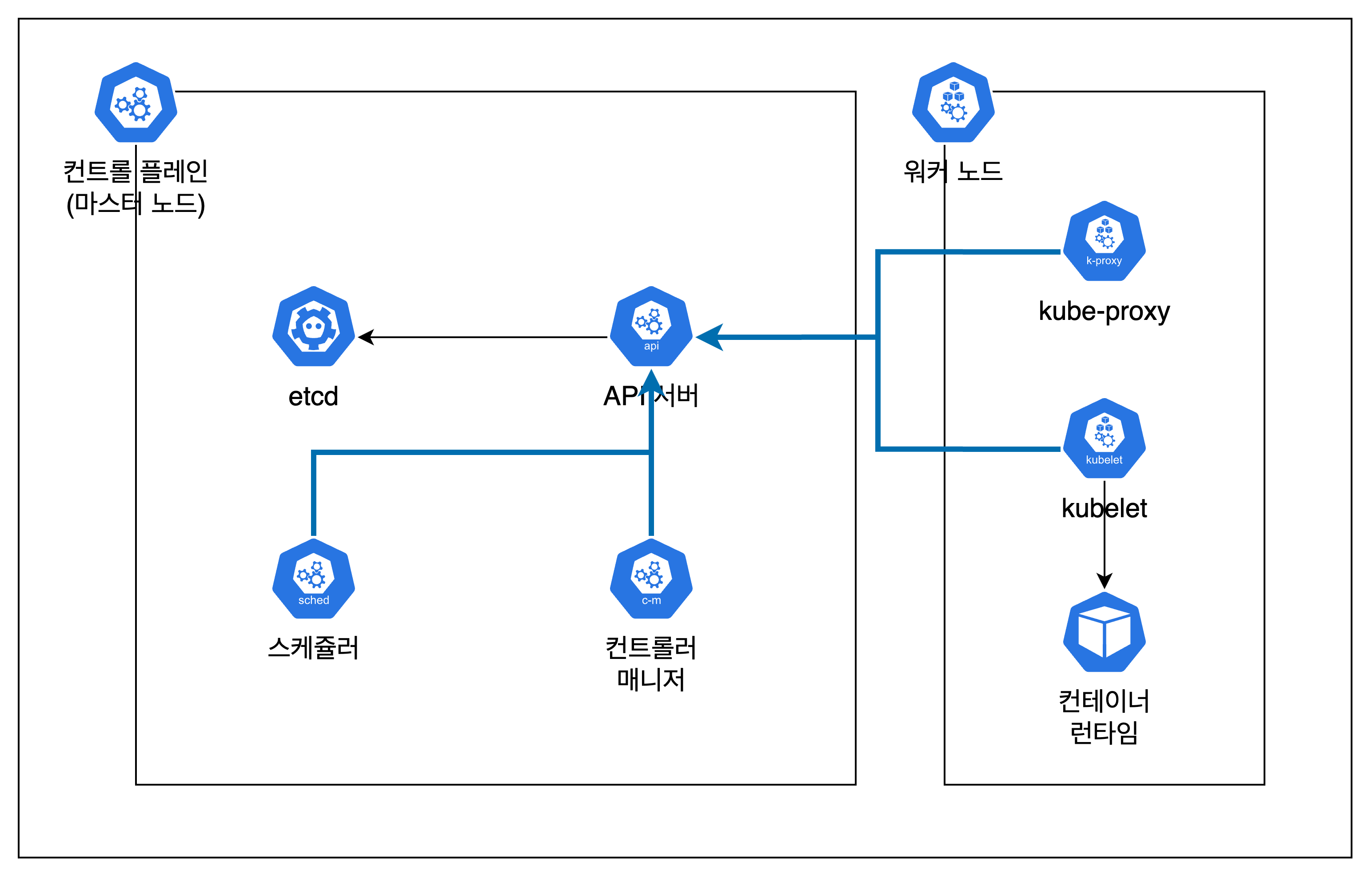 API 서버는 그 이름처럼 API를 받아서 이를 처리하는 리소스인데, 외부 클라리언트가 kubectl 등으로 요청을 전송하면, RESTful API로 변경하여 클러스터를 조작합니다. API 서버 내부에서는 그 요청을 보낸 주체가 누구인지 인증 플러그인을 거치고, 권한 승인 플러그인으로 리소스에 대해 요청을 수행할 수 있는지 결정한 다음, 승인 제어 플러그인을 통해 리소스를 수정/삭제 혹은 거절합니다. 최종적으로 리소스의 상태와 데이터 등을 etcd에 저장합니다.