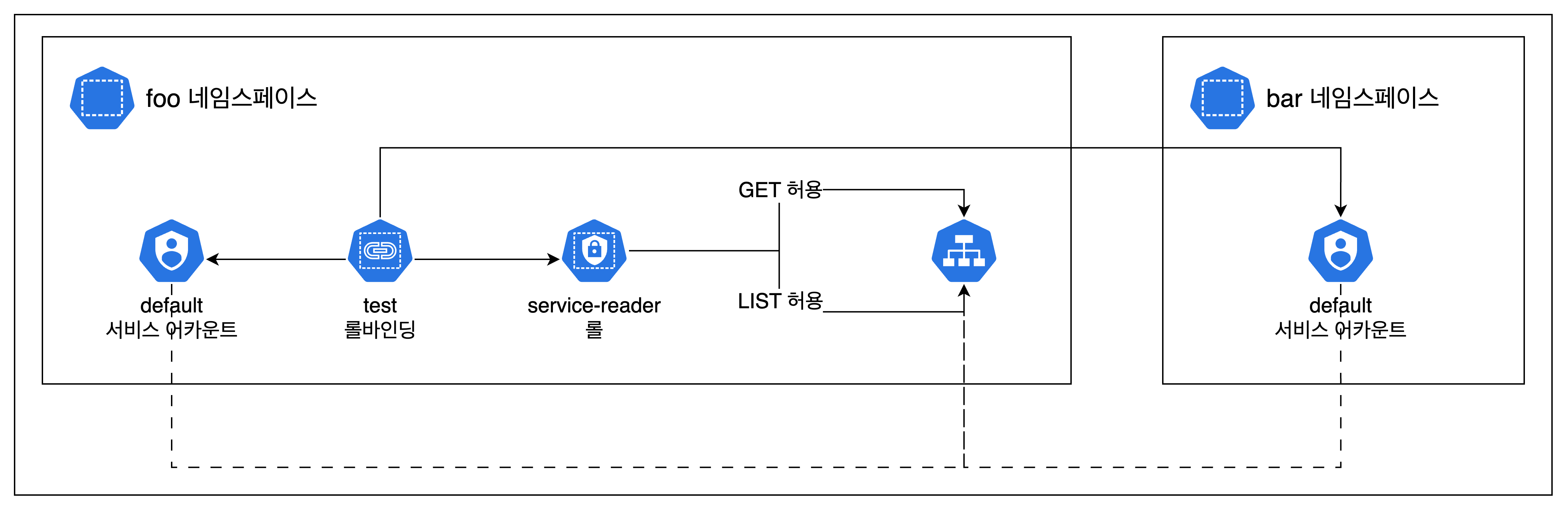 이렇게 하면 롤 바인딩은 foo 네임스페이스에 있지만, bar 네임스페이스의 default 서비스 어카운트에서 foo 네임스페이스의 서비스에 get, list할 수 있는 역할을 바인딩받습니다.