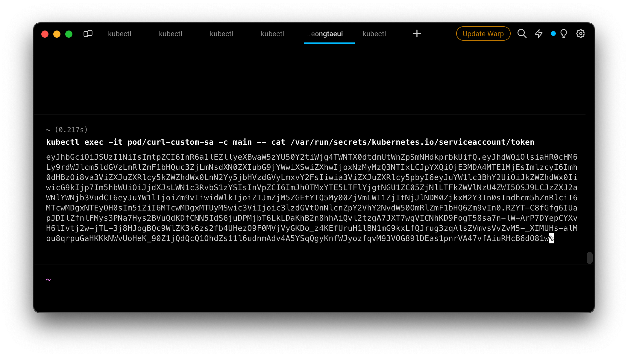 서비스 어카운트를 사용하면 토큰이 파드 속 컨테이너에 마운트 되므로 컨테이너 내부로 접속하면 각 토큰을 확인할 수 있습니다