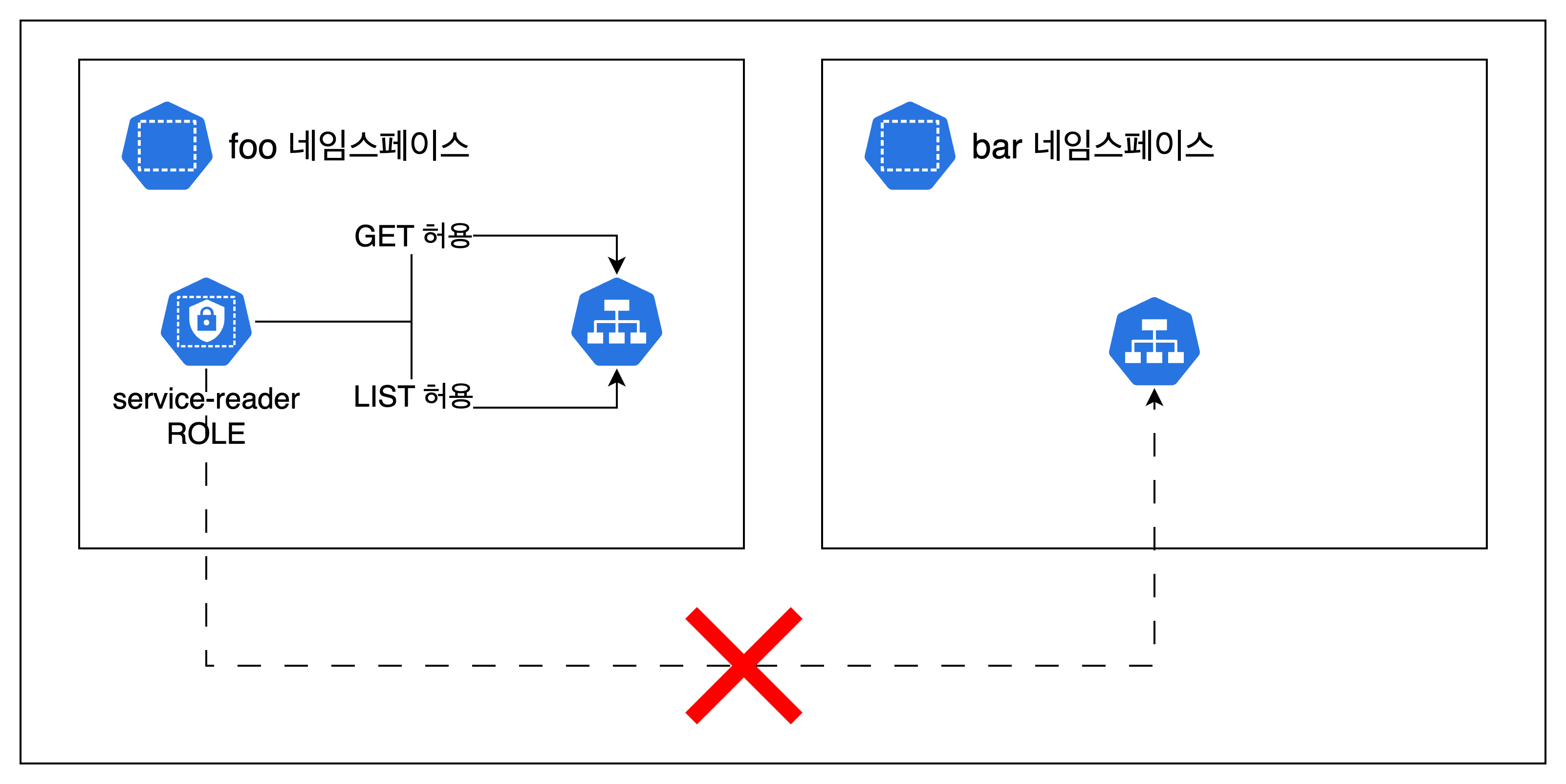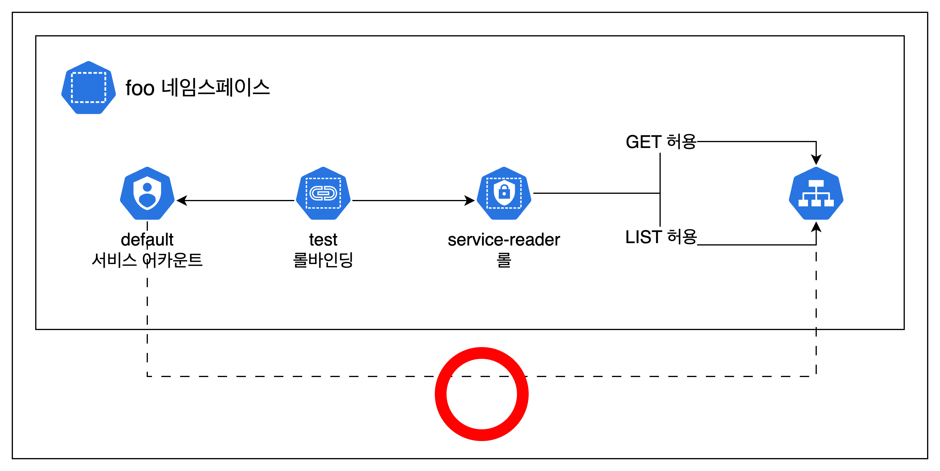 위는 foo namespace의 service 리소스에 get과 list를 허용하는 역할을 의미합니다. apiGroups는 서비스의 apiGroup으로 core apiGroup은 공백으로 표기합니다. 그림으로 보자면 아래와 같습니다.