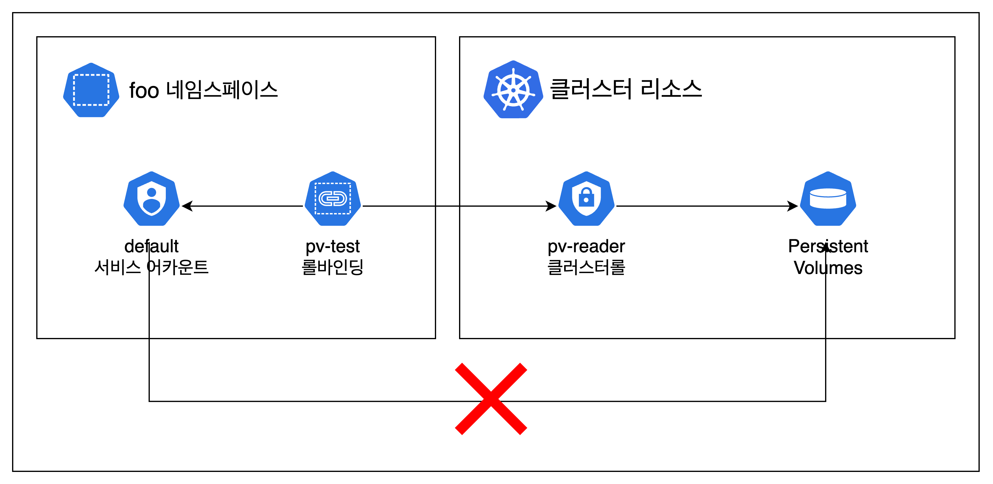 이제 클러스터 수준으로 리소스에 작업을 수행할 수 있습니다. 클러스터롤과 클러스터롤바인딩을 사용하면 아래와 같은 리소스 형태를 가집니다.