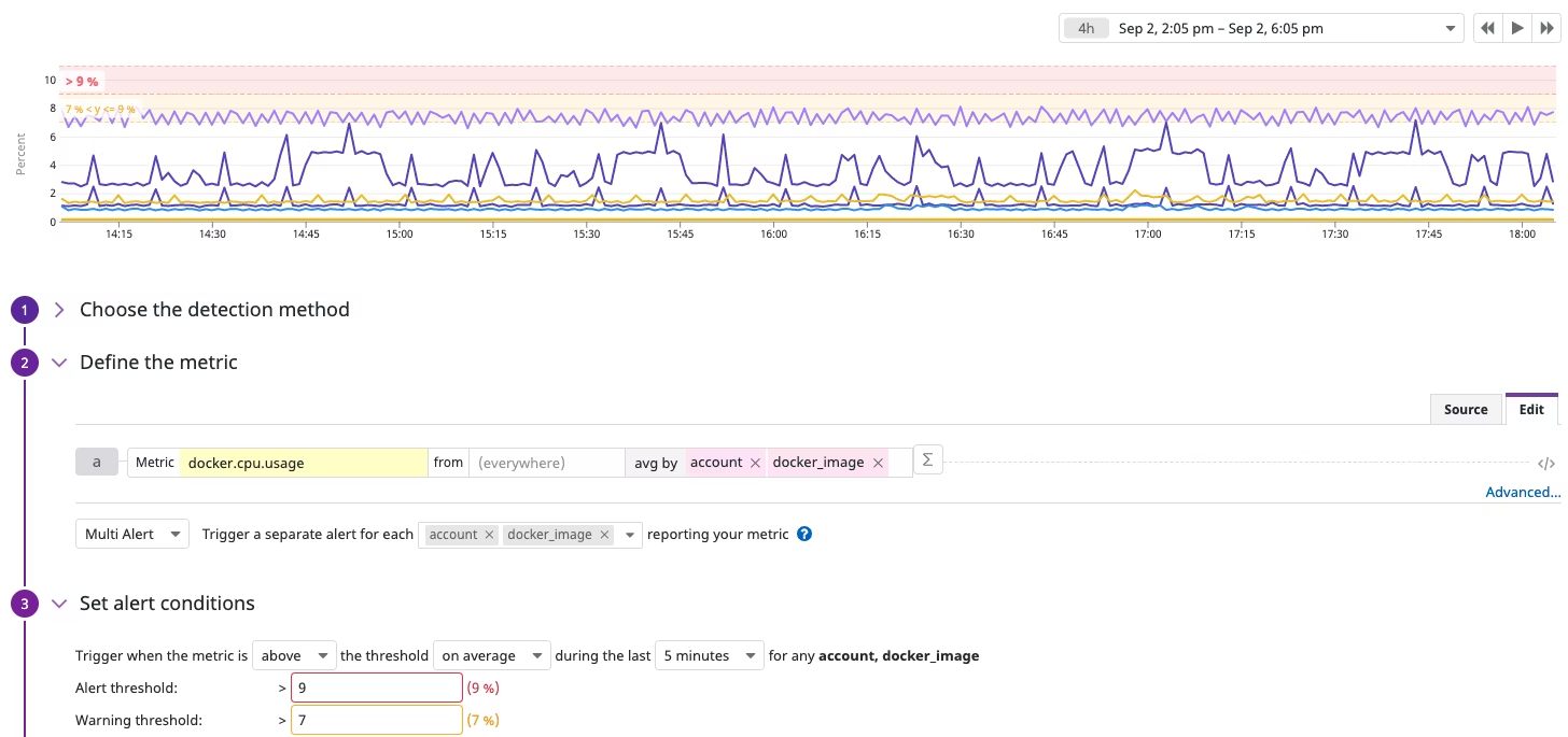 중요한 변경 사항을 확인하기 위해 모니터링을 생성할 수 있습니다. 메트릭을 쿼리를 통해 정의하고, 특정 Threshold를 설정하여 알림을 받을 수 있습니다.