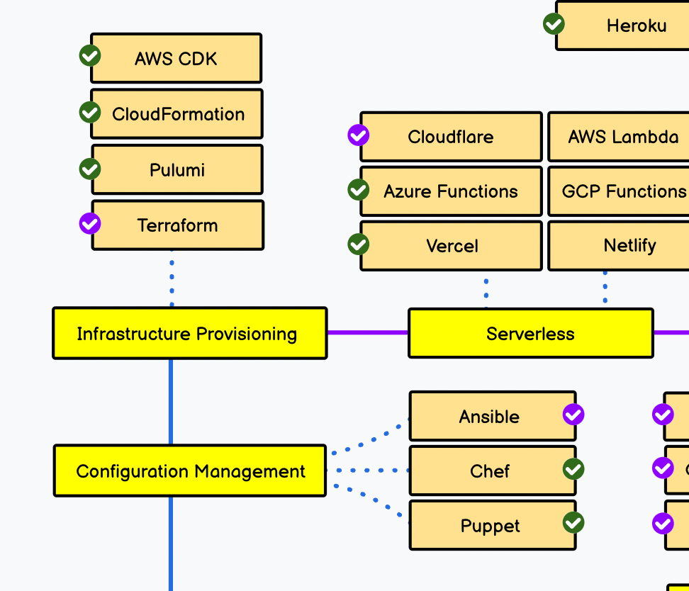 인프라 구조마저 코드로 조작하고 있는 현재, 가장 많이 쓰이는 도구는 테라폼과 앤서블이 있습니다. DevOps Loadmap에서도 두 가지 방법을 가장 권장하고 있네요!
