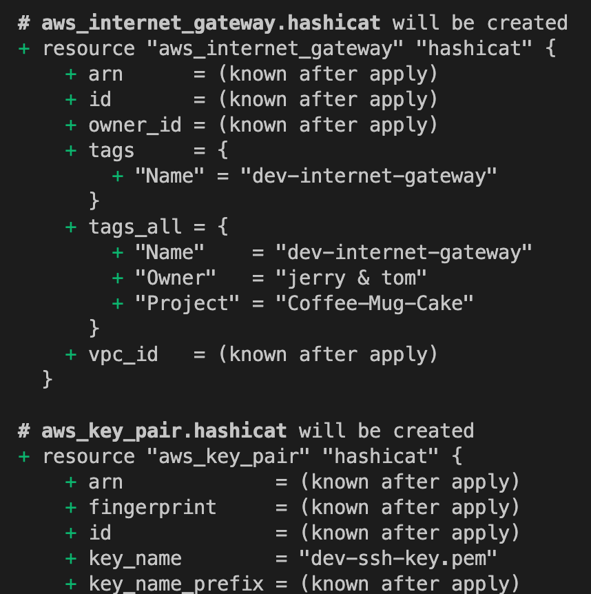 아래 터미널 출력처럼 생성될 인프라 리소스들을 확인할 수 있습니다.