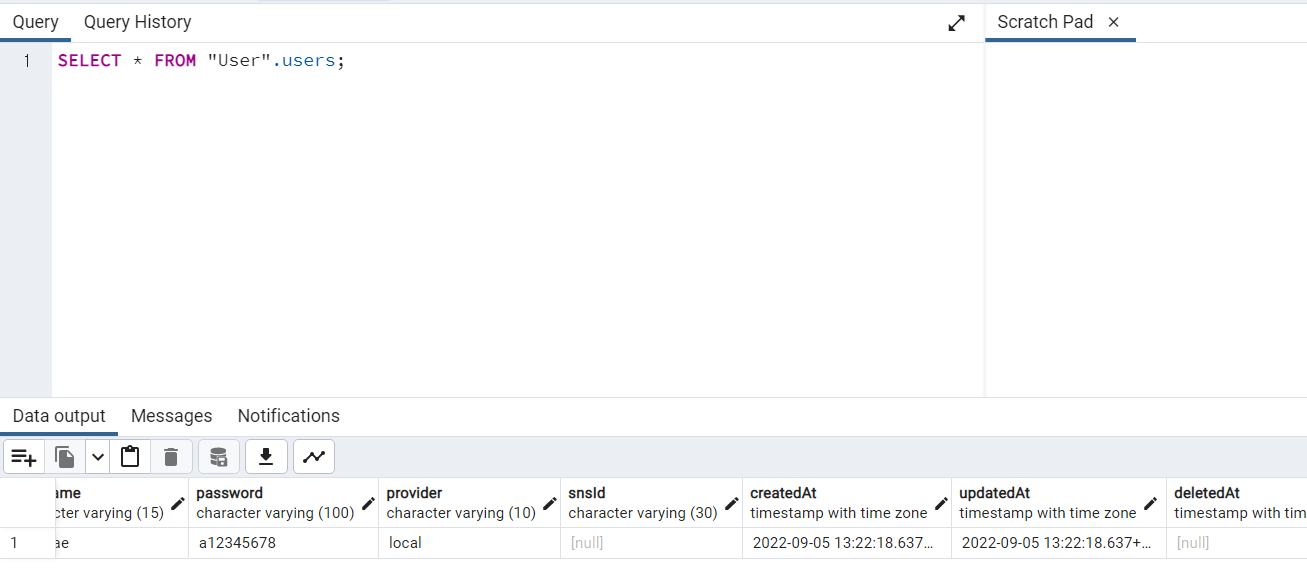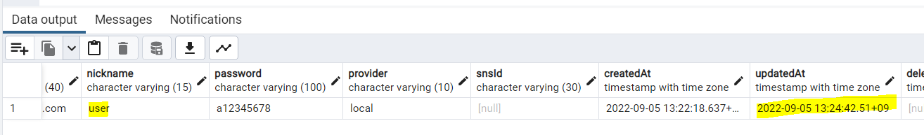 pgAdmin을 통해서 테이블의 데이터를 조회한 결과 닉네임과 updatedAt의 데이터가 업데이트된 것을 볼 수 있습니다. 여기서의 문제점은 같은 닉네임을 입력하더라도 정상적으로 처리가 된다는 점입니다. 그래서 같은 닉네임을 사용하지 않도록 조정하는 과정이 필요해 보입니다.