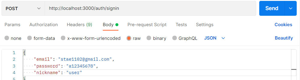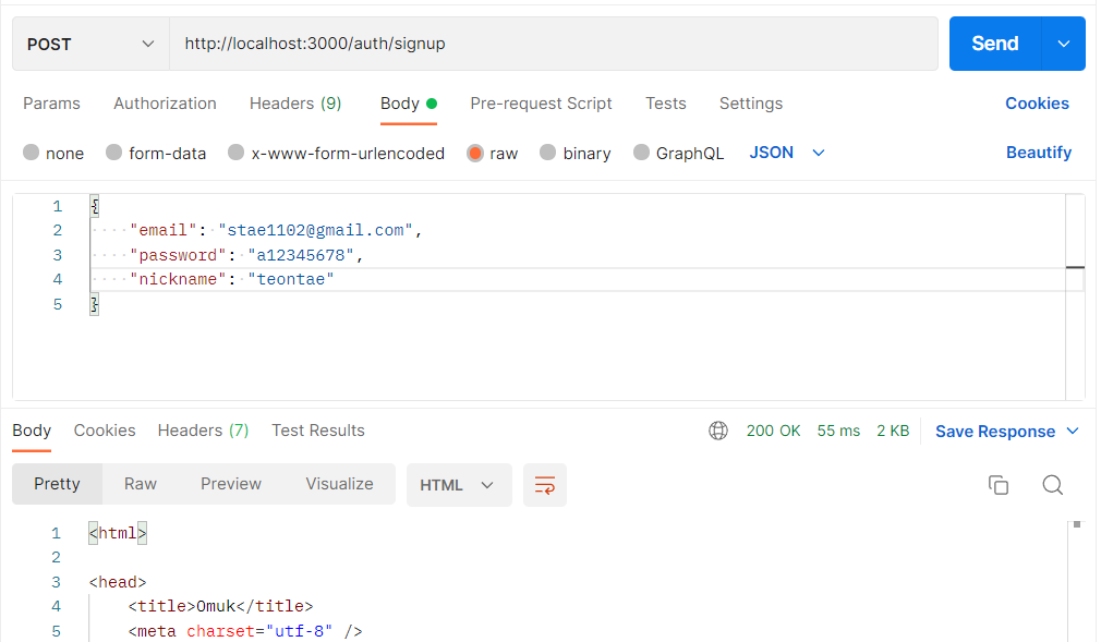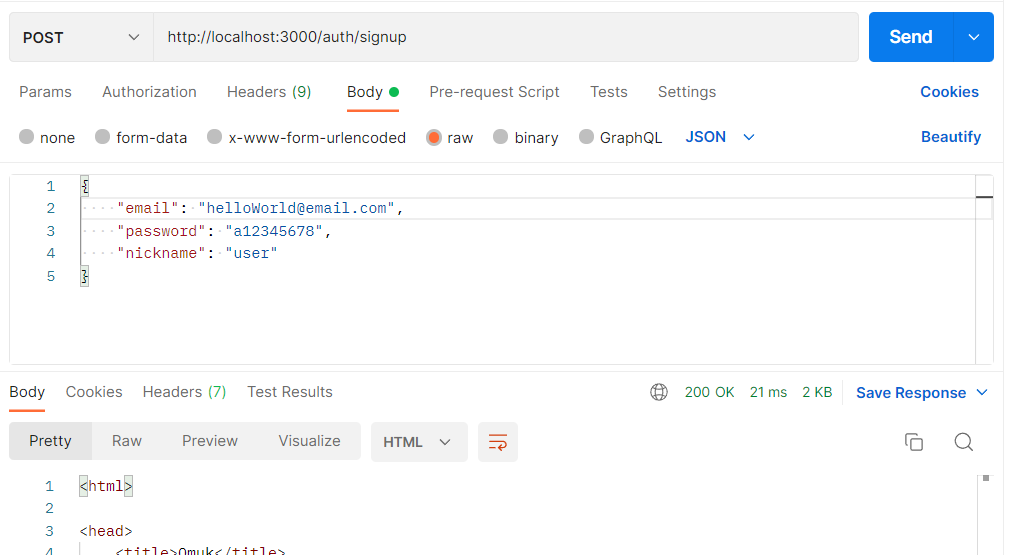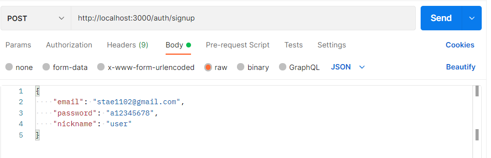 일단 POST /auth/signup 요청을 통해 회원가입하여 데이터베이스에 값을 넣겠습니다.